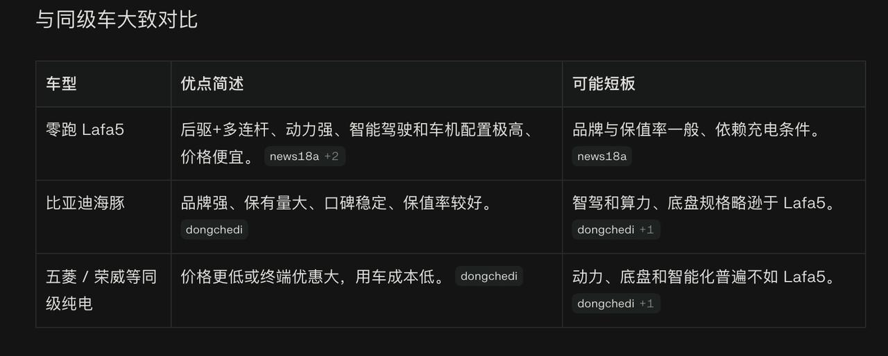 从产品力和价格来看,零跑 Lafa5 对于有充电条件、预算 10–12 万、主要城市通勤和偶尔高速出行的用户,整体是“值得入手、性价比很高”的一款纯电车。如果特别在意品牌溢价或长期保值率,或者没有稳定充电条件,就要谨慎一些。 适合入手的情况 - 家庭或个人预算在 10–12 万,希望买一台空间够用、配置高、用车成本低的代步车,Lafa5 的续航(515/605 km)、快充和智能配置都比较有优势。 - 重视驾驶感和底盘质感,Lafa5 是后驱+前麦弗逊/后多连杆独立悬架,联合大厂调校,操控和舒适性在同价位纯电紧凑车中属于上游水平。 - 看重智能化体验:高通 8295P 芯片、大屏车机、高阶辅助驾驶(含激光雷达、城市/高速领航、自动泊车等),放在 10 万级里配置很“卷”。 需要考虑的短板 - 品牌与保值:零跑整体知名度和品牌溢价不如比亚迪、广汽等头部车企,二手保值率预计会偏一般,适合“开到报废”或至少长期持有的用户。 - 纯电属性:需要有固定或相对便利的充电条件;经常长途跑高速且沿路补能不方便的话,纯电会不如混动省心。 - 服务网络:零跑网点、售后覆盖在一二线城市还可以,但三四线城市可能不如传统大厂密集,买之前要查一下本地的销售和服务中心情况。【来自懂车帝车友圈】