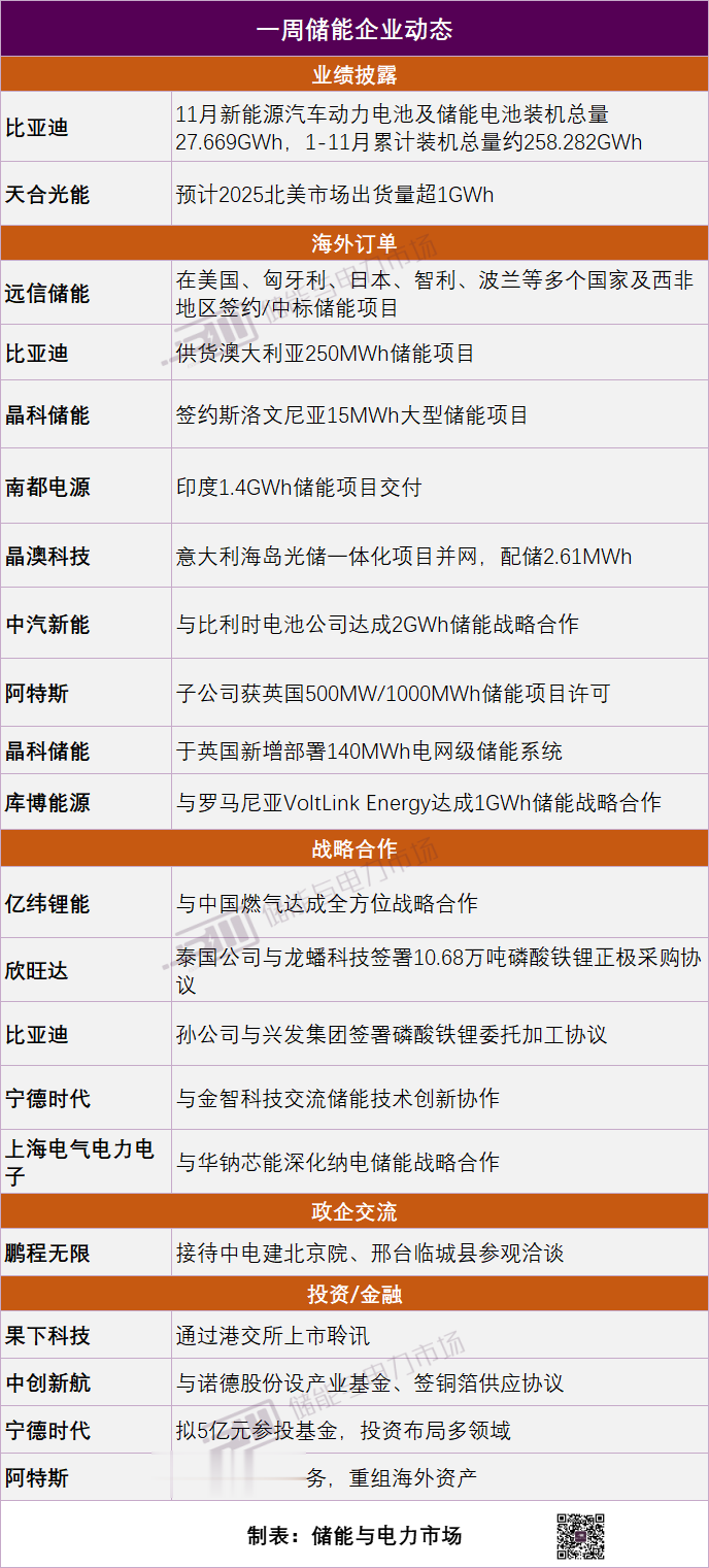 本周(12.1-12.5),部分储能企业在业绩披露、海外订单情况、战略合作、投资金融等方面表现如下:
