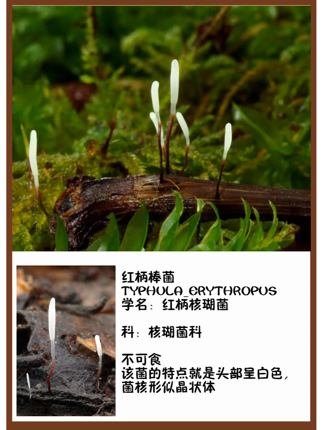 红柄棒菌 typhula_erythropus 学名:红柄核瑚菌 科:核瑚菌科 不可食 该菌的特点就是头部呈白色,菌核形似晶状体 颜值真的很高,但图片也是真的少,找了一圈只有两张图[哭惹R]