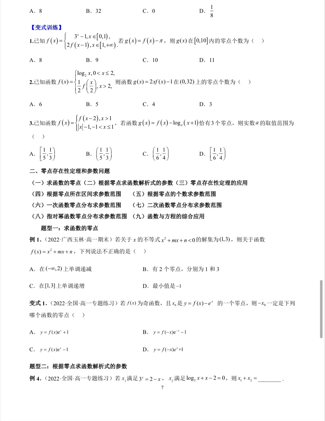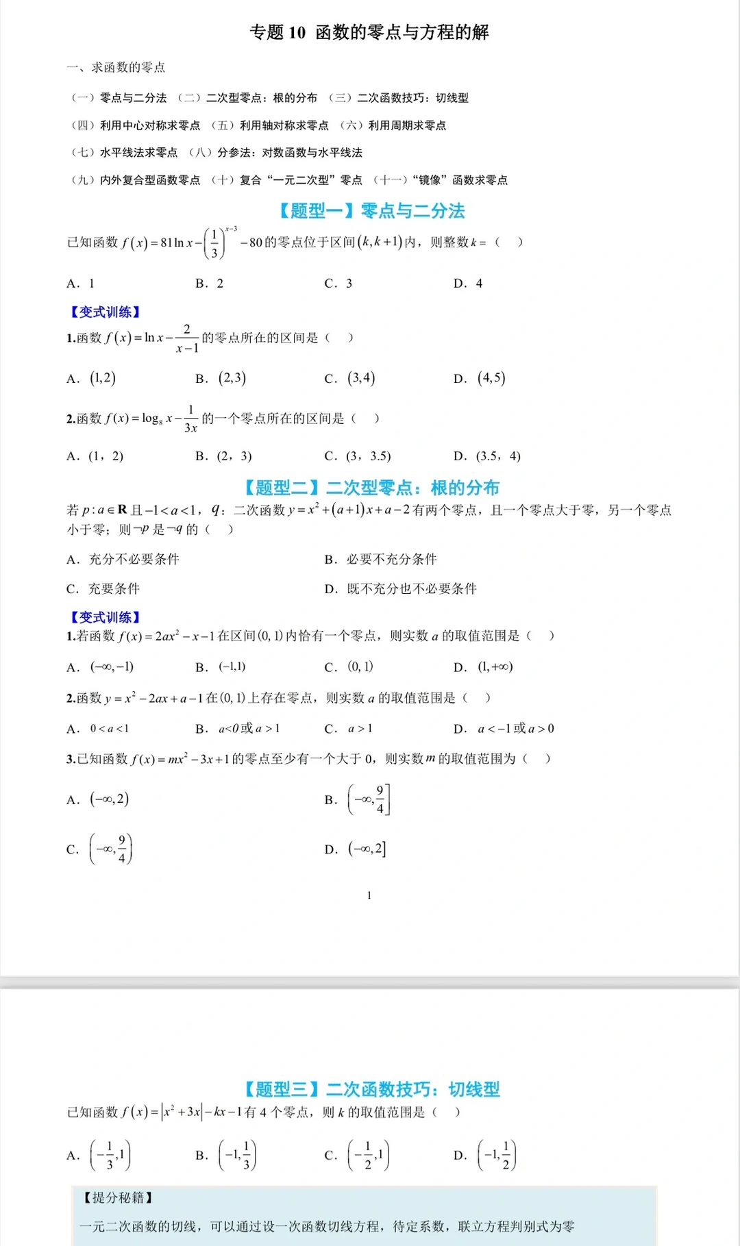 这是一个讲课的思路和框架,实在不想抄题了,打算明天把这个资料印出来先做了再备课。感觉想要学好函数的零点,就必须加大做题量,熟能生巧~ 关于复合函数的零点个数问题,用换元法,分别探讨内外函数的零点个数或范围。一是设出内层函数,二是作出内外层函数的图像;内外层函数图象相结合确定交点个数。