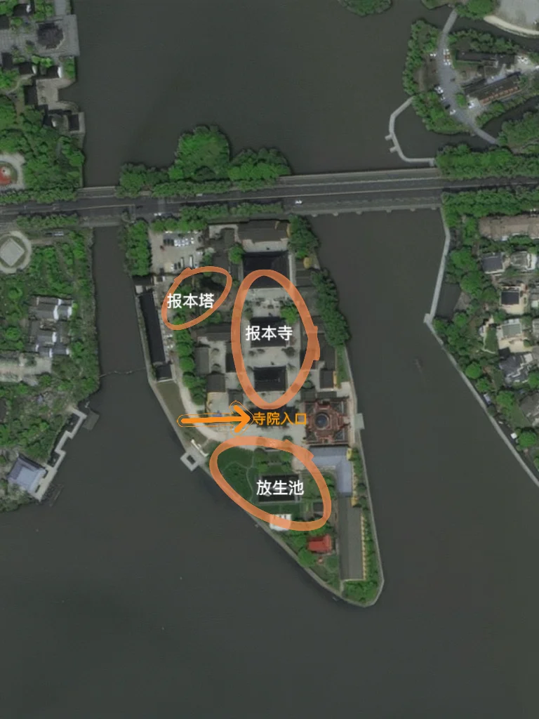 图2报本禅寺所处的位置名‘鹦鹉洲’,有桥连接的湖心叫洲、需要坐船的就叫岛。直白点说就是,报本禅寺四面环水。