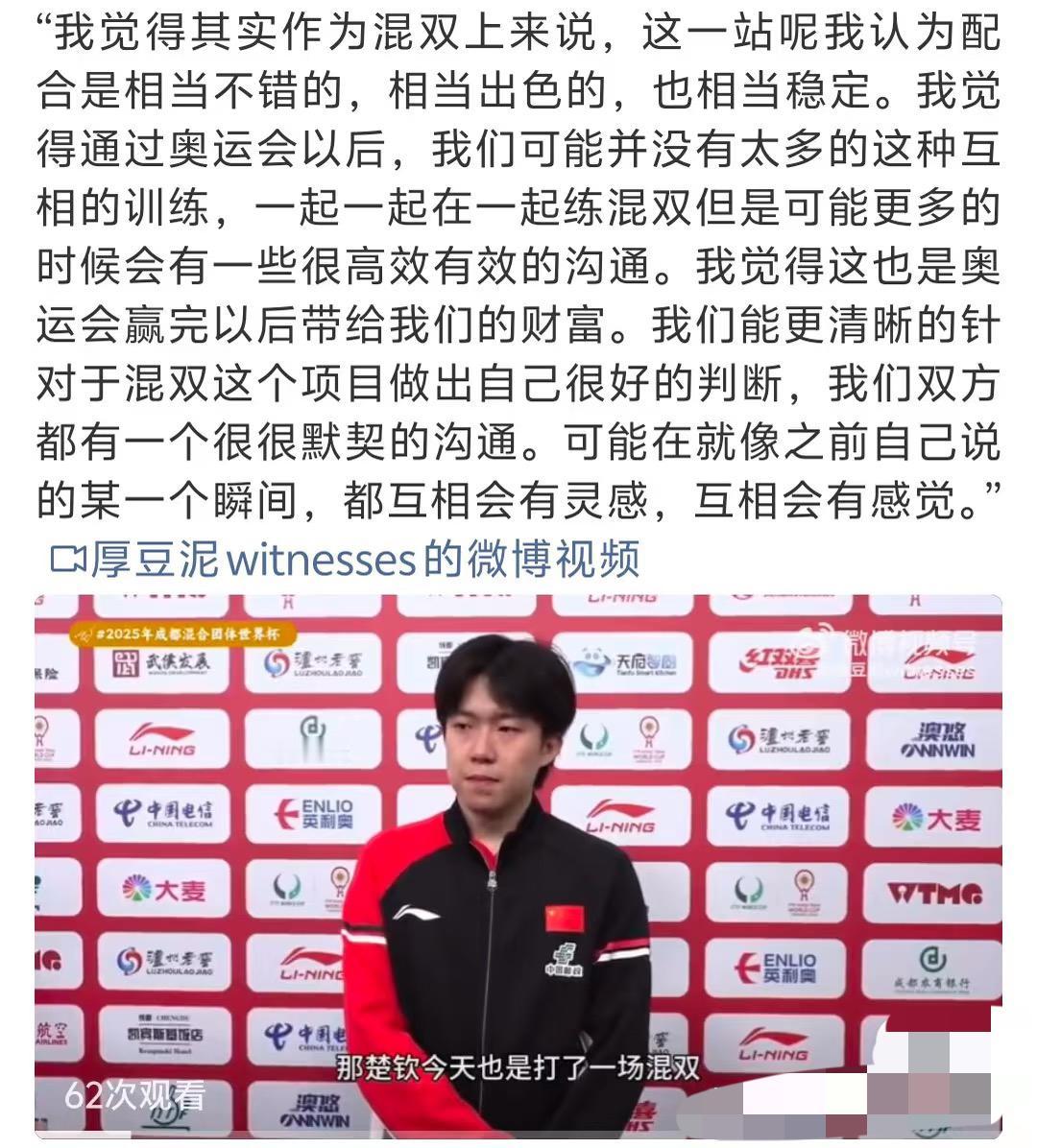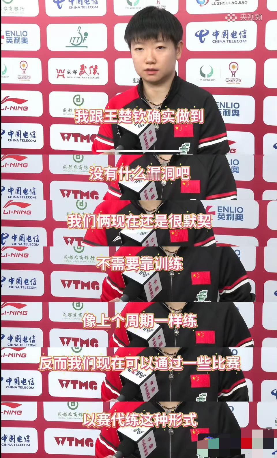 王楚钦罕见自信的说“混双,这个世界上也不太好有人能赢得了我们!” 很少看到王楚钦在语言上 这么自信过! 孙颖莎是肯定莎头的战绩, 不需要磨合, 通过比赛,以赛代练! 王楚钦却自豪的说, 很少有人赢我们! 莎头之间有非常高效的沟通方式, 相互有灵感, 他们共用一个生物电波, 靠灵感打球, 外协是防不胜防, 两个人越打越兴奋, 这就是绝对的统治力! 王楚钦说到混双时底气十足, 骄傲又自信,这一切都靠成绩 打出来的!