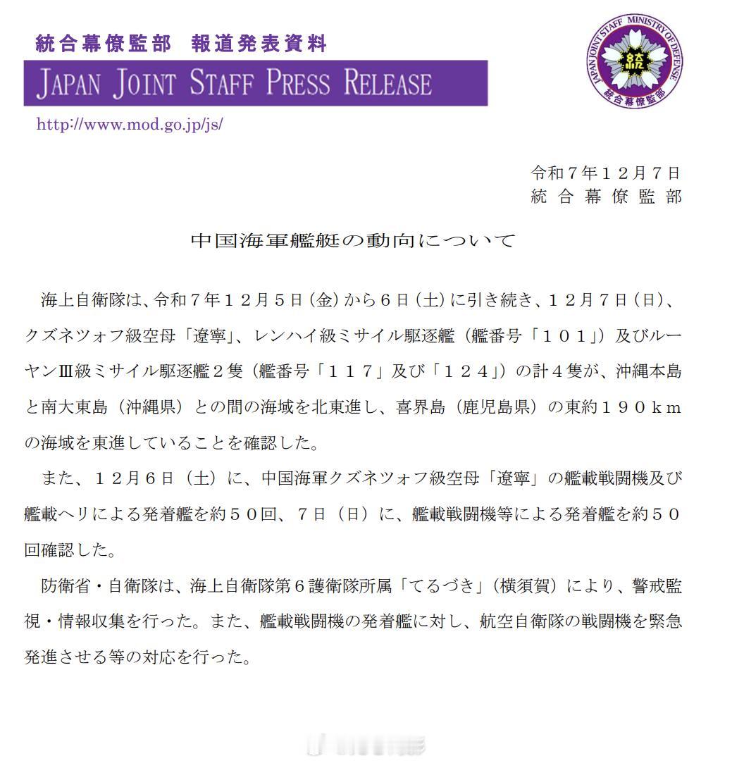 “辽宁”舰昨天和前天分别进行了约50架次舰载战斗机和直升机起降,昨天首次沿琉球群岛东南侧北上,已航行到距喜界岛约190公里的海域,这是“辽宁”舰出岛链训练最靠近日本本土的一次。接下来,大辽会不会继续北上?