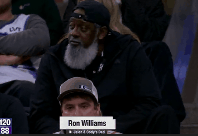第四节比赛,科迪-威廉姆斯杀入禁区上篮再中连拿4分,镜头给到观众席的父亲。