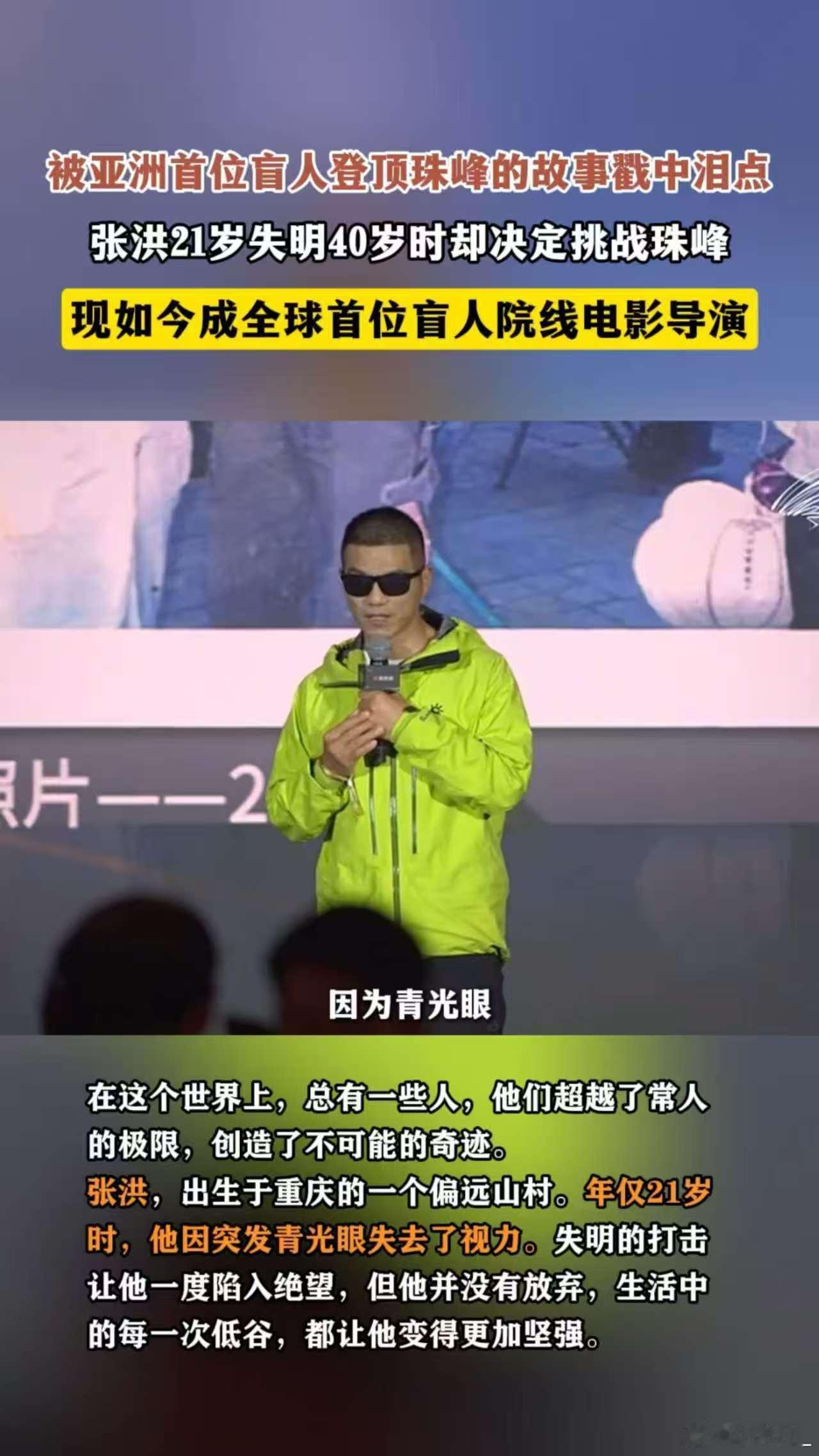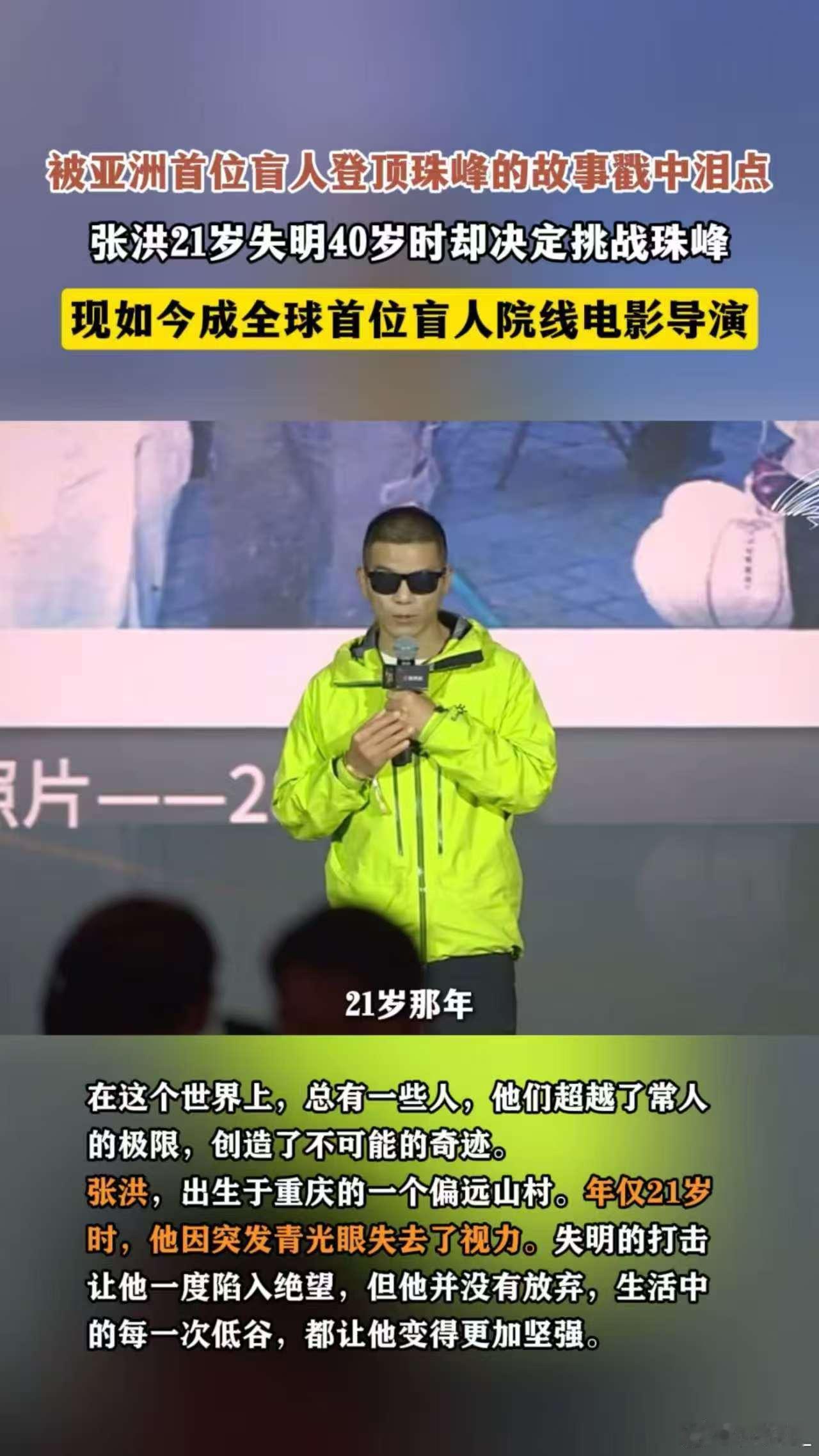 亚洲首位盲人登顶珠峰的故事太燃了刷到张洪的故事直接破防!看不见珠峰的壮美,却靠双脚丈量顶峰,靠信念扛过缺氧和狂风。如今当导演把这段经历搬上银幕,让更多人看到坚持的力量,这才是真·人生主角啊~珠峰登顶者成全球首位盲人电影导演