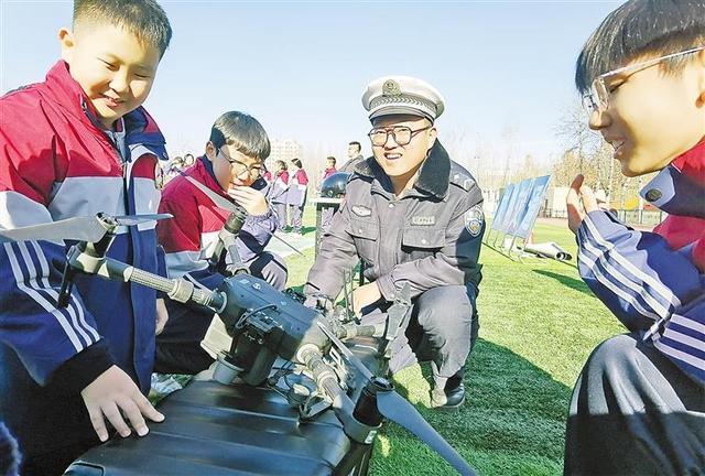 与传统宣讲不同,此次活动中,交警们带来的“黑科技”无人机一亮相就吸引了同学们的目光。这架搭载高清摄像头的无人机盘旋在操场上空,实时回传画面,交警通过机载喊话器模拟路面纠纷场景,向同学们普及“一盔一带”等交通安全知识,让大家直观感受科技在交通安全管理中的应用。