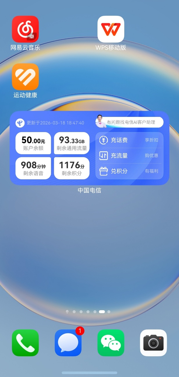 生活类刚需卡片也很实用,鸿蒙版中国电信的服务卡片放桌面,剩余流量、话费看得明明白白,再也不用去App里翻找啦!