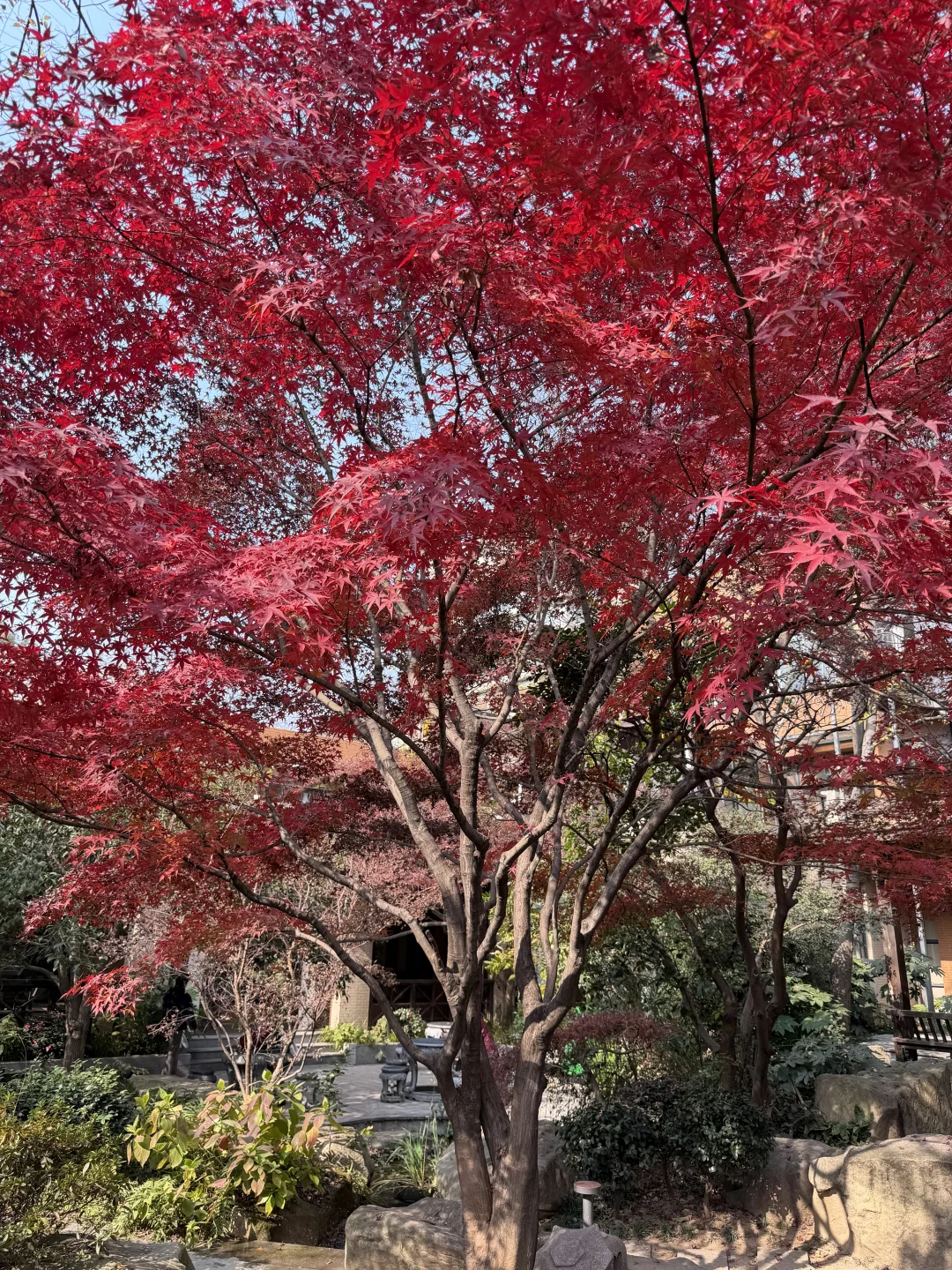 最近枫叶开始红了,东湖盆景园、青山公园、紫阳湖公园超多人,很难找到机位。离市区50分钟车程的蔡甸花半里园艺小镇也藏着超美的红枫林。日式风格庭院里,小桥流水、红叶似火,几棵鸡爪槭正值最佳观赏期。最重要的是人少!几乎可以实现包场。园子里还有咖啡厅、茶座、餐厅,很适合周末拍照休闲。 直接导航:中国园艺小镇(半里花舍),免门票🎫,停车免费🆓,从停车场步行几分钟就可以看到红枫了。 附近还有野生动物园、九真山、香草花田等景区可一并游玩。