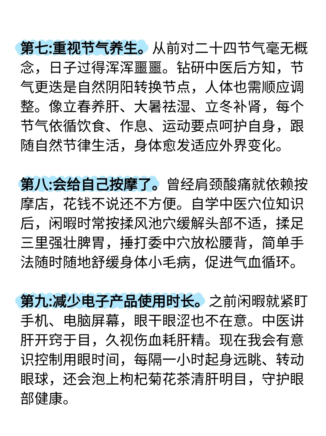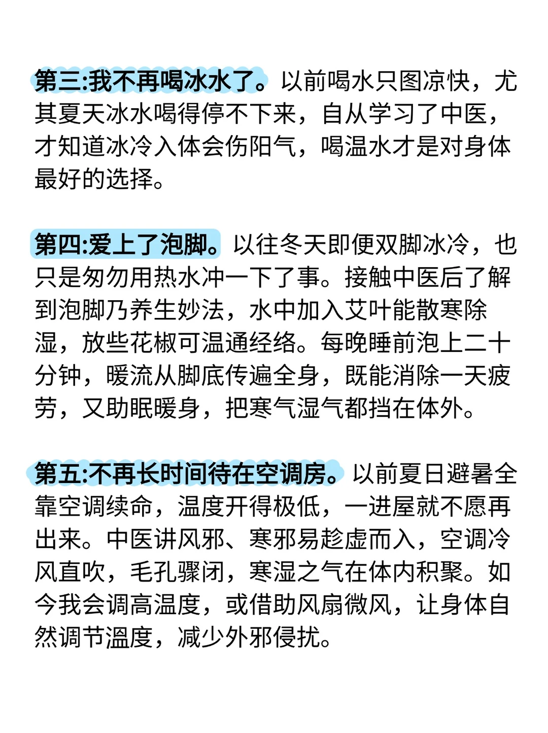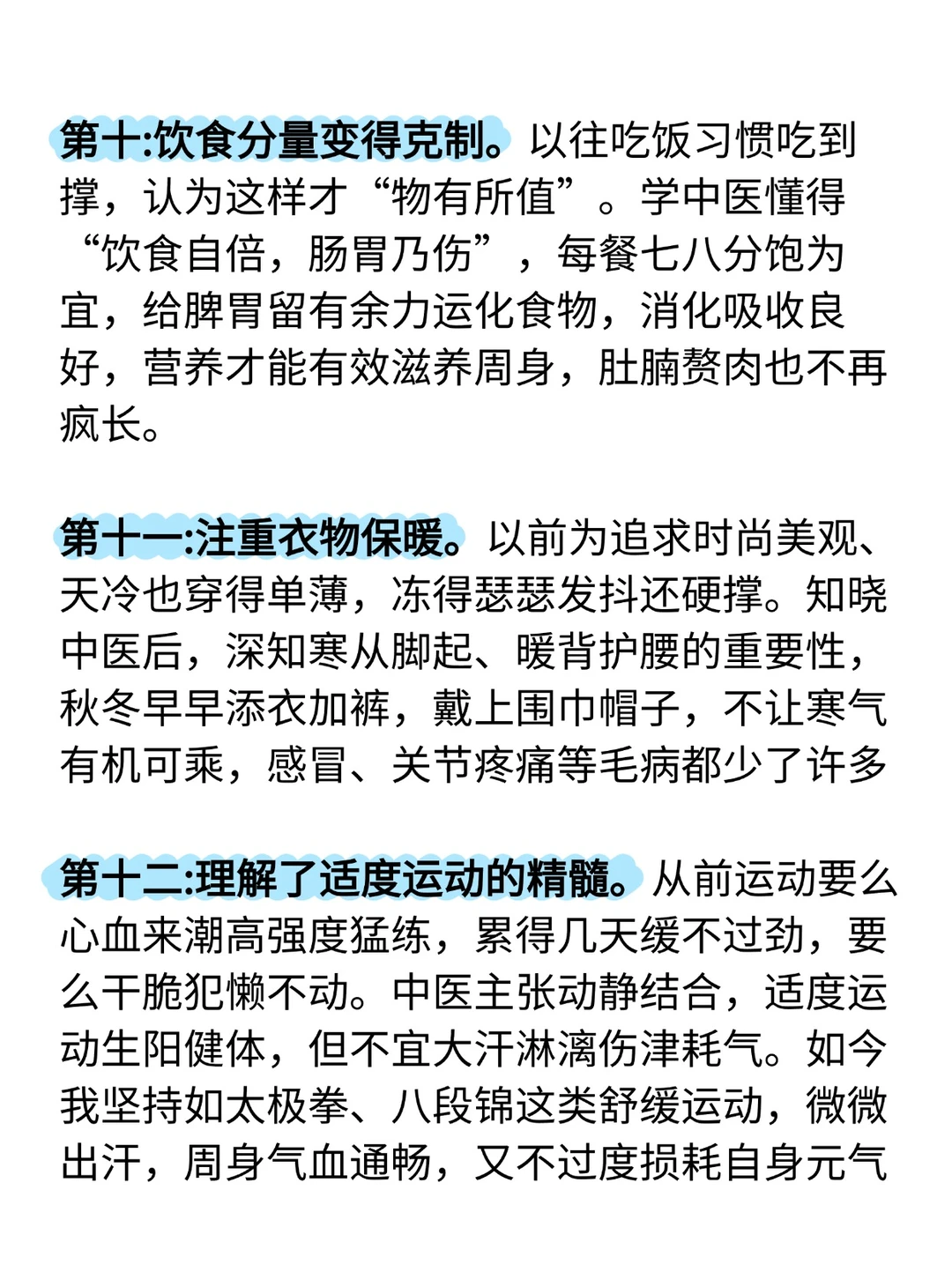自从学习了中医,以前不相信的事情,我相信了,有了12个改变,比如水果尽量不吃,注意保暖等等,你们有什么改变呢?