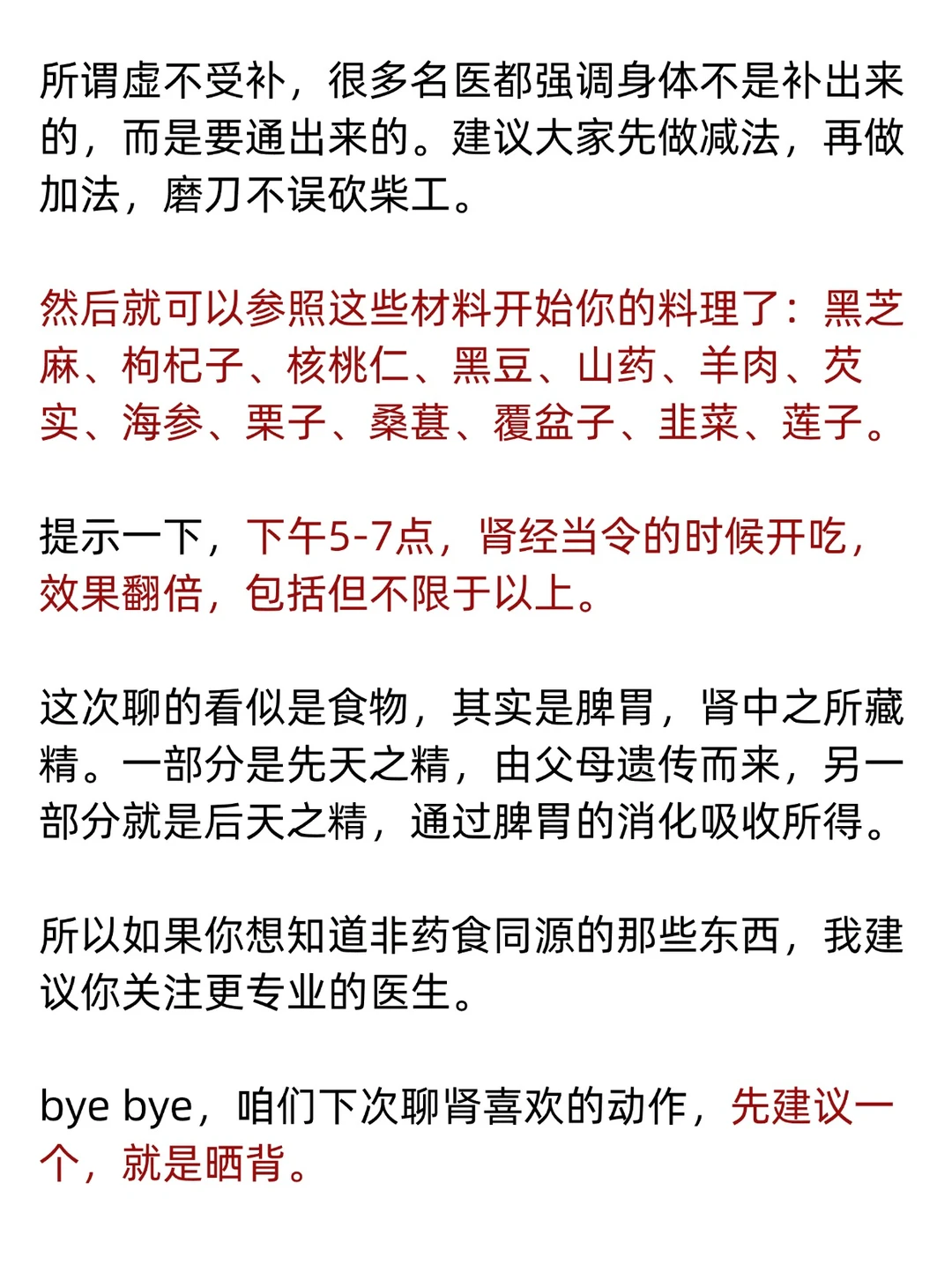 懒人通关秘籍: 养肾先通三焦和脾胃,吃饭八分饱,给胃留条活路; 肾喜欢的食物:黑豆、核桃,羊肉等; 黑入肾经,专治各种不服,肾经当令(下午5-7点)吃,效果翻倍; 你熬夜蹦迪、情绪坐过山车,吃再多黑科技也赶不上漏的速度。