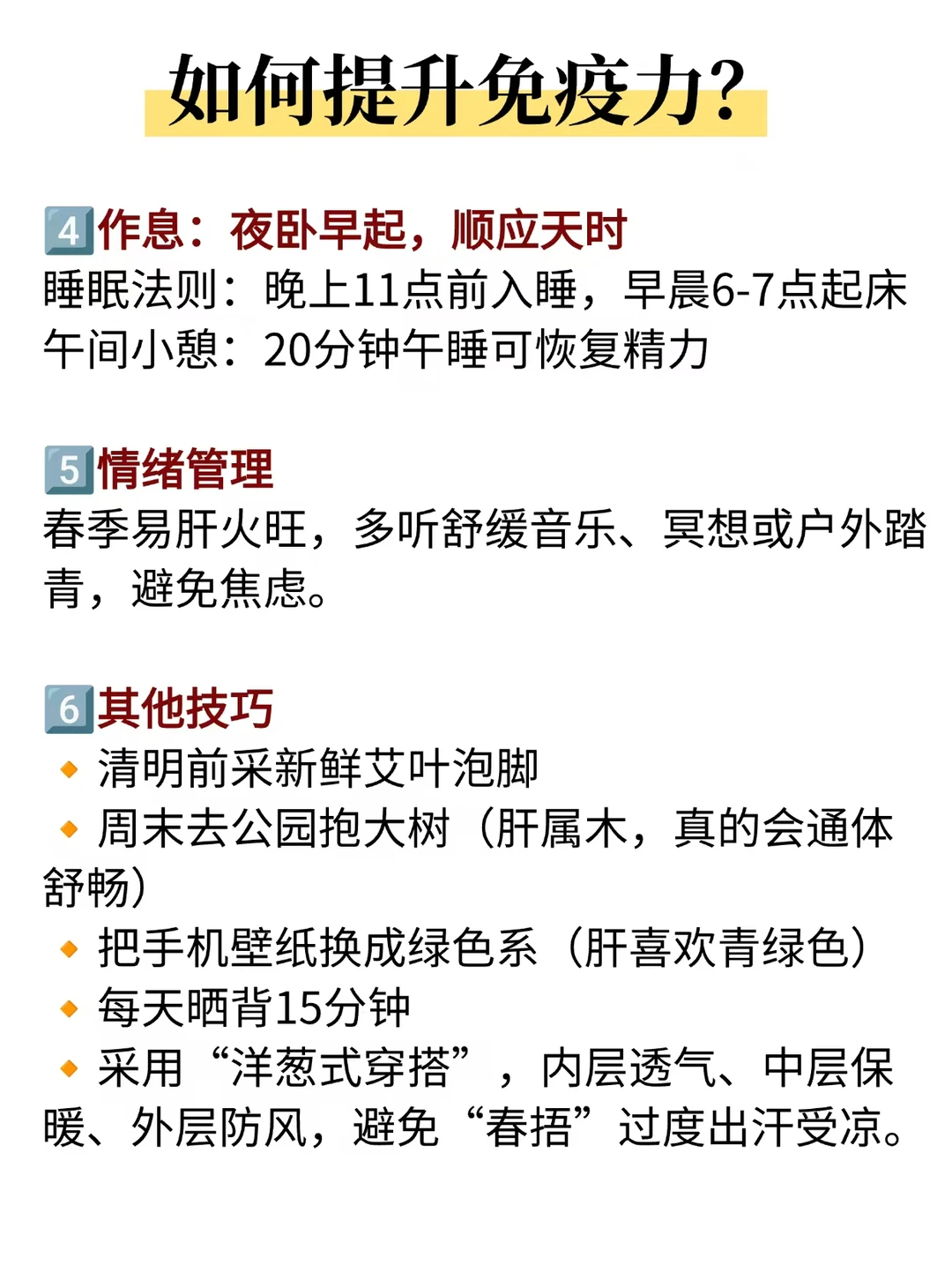 从中医来看,春季对应“肝木生发”,肝气疏泄与免疫调节密切相关。此时顺应天时调养,可助阳气生发,增强“正气”抵御外邪。此外,春季气温波动大,提前提升免疫力,能更好应对健康挑战。