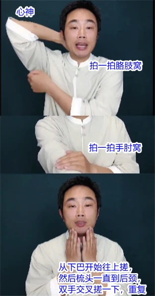 然后是头面和这个颈部,从下巴开始往上搓,然后梳头一直到后颈,双手交叉搓一下,重复做到明显放松的状态。