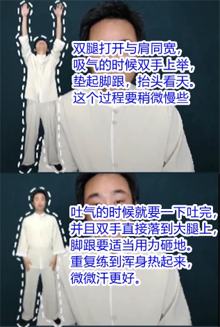 除了这些之外,再说一个可以同时安抚 3 个孩子的锻炼方法,双腿打开与肩同宽,吸气的时候双手上举,垫起脚跟,抬头看天。这个过程动作要稍微缓慢一些,吐气的时候就要一下吐完,并且双手直接落到大腿上,脚跟要适当用力砸地。重复练习到浑身热起来,微微汗更好。