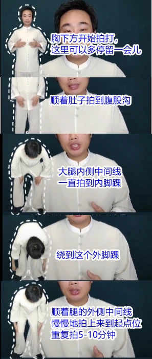 有一个拍打方法,首先在房子下方开始拍打,这里可以多停留一会儿。然后顺着肚子、腹股沟、大腿内侧中间线一直拍到内脚踝,然后绕到这个外脚踝,顺着腿的外侧中间线慢慢地拍上来,一直到这个起点位置,就这么重复地去拍,打 5 分钟到 10 分钟就可以了。