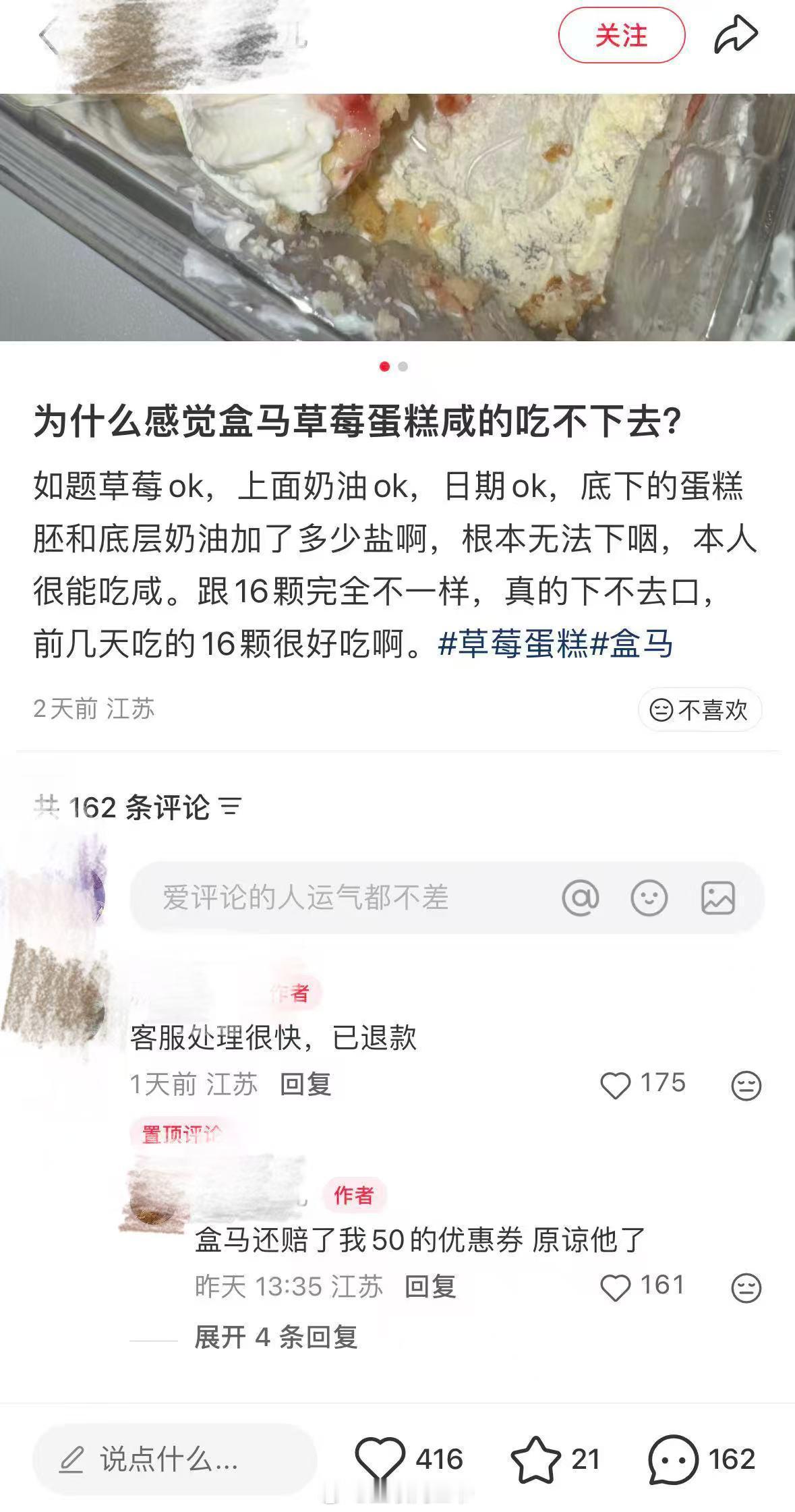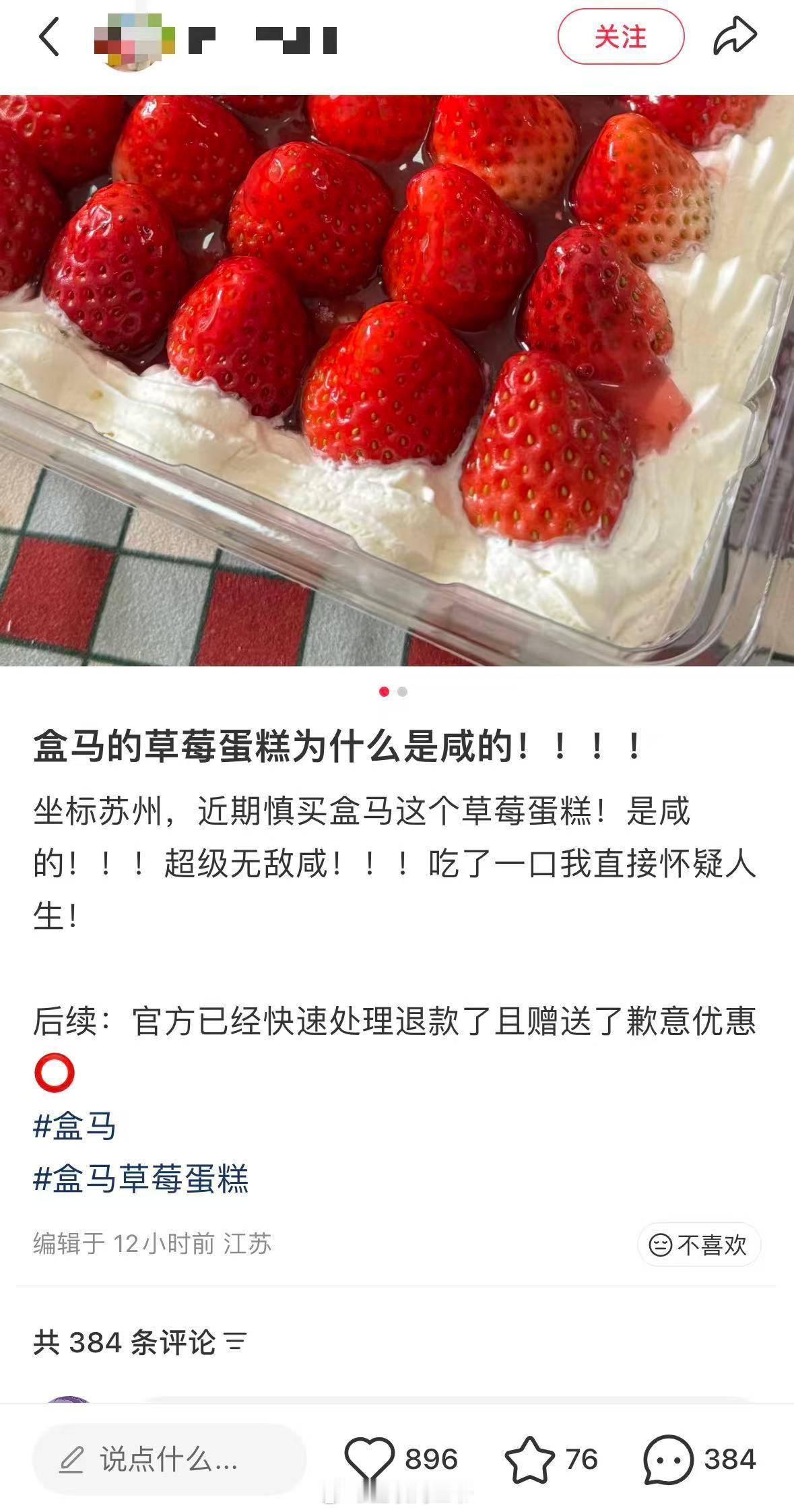 盒马承认生产草莓蛋糕出问题 盐焗草莓蛋糕了……这确实有点草台班子了,谁在家还没把盐当糖用过呢,哈哈哈。貌似是江苏的一批供货商出了问题,盒马回应了确有一批次草莓盒子蛋糕存在生产问题,支持售后处理。这款也是蛋糕也是标志性大单品,自2021年惊艳问世以来连年攀升,更是有单季销售额破亿的表现,是商超烘焙领域的现象级产品。这次事件发生后,其实盒马也第一时间介入了,我看红薯不少网友还发了,吃到咸的就去进行了退款和补偿,还收到了道歉补偿的优惠券!