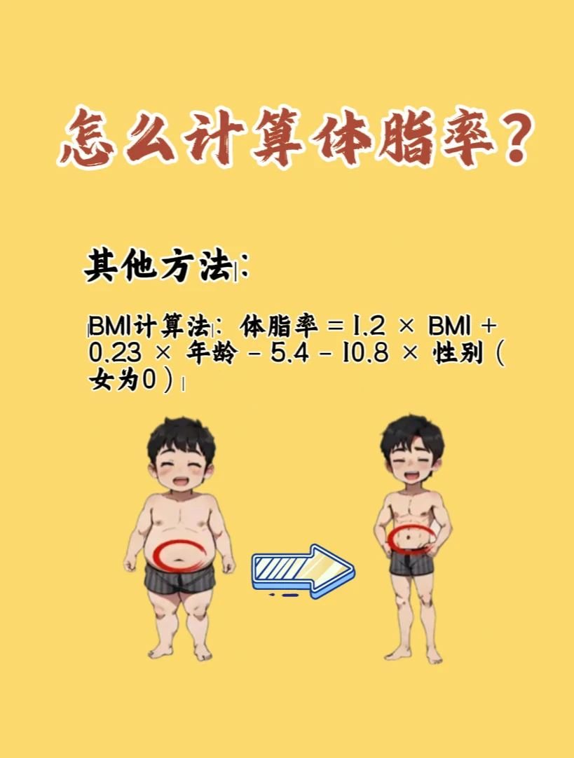 BMI计算法:体脂率 = 1.2 × BMI + 0.23 × 年龄 - 5.4 - 10.8 × 性别(女为0);