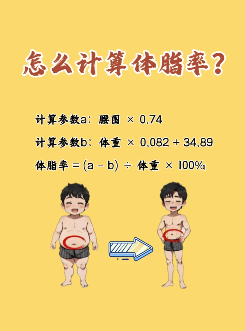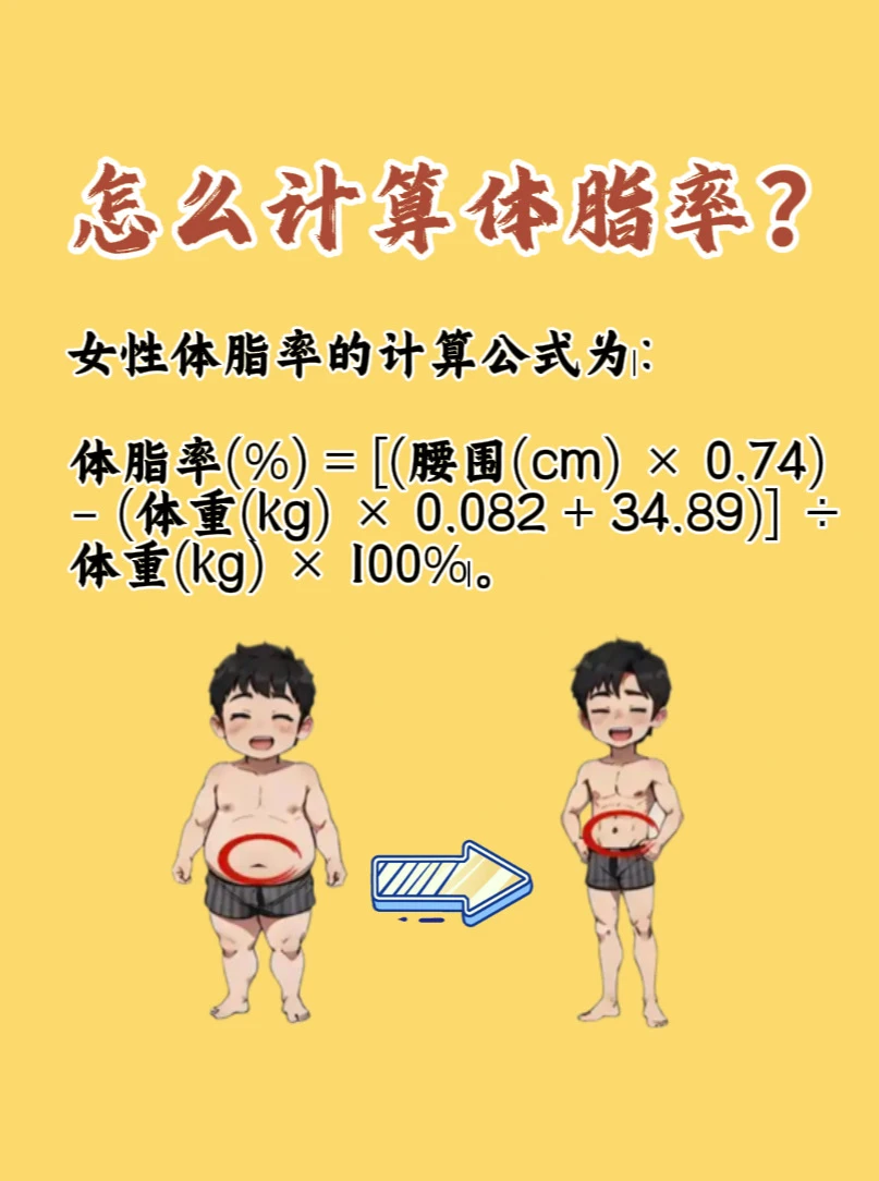 体脂率(%) = [(腰围(cm) × 0.74) - (体重(kg) × 0.082 + 34.89)] ÷ 体重(kg) × 100%。