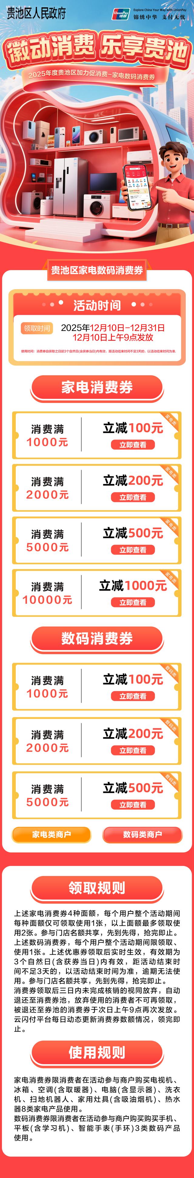 1.领取规则:活动期间,贵池区域内消费者通过云闪付APP定位池州市,点击池州消费券,进入“徽动消费·乐享贵池”惠民消费券专区领取。消费者每人可领取不同面额家电产品购新消费券共计不超过2张,不同面额数码产品购新消费券不超过1张,总计不超过3张。云闪付平台每日动态更新消费券数额情况,领完即止。