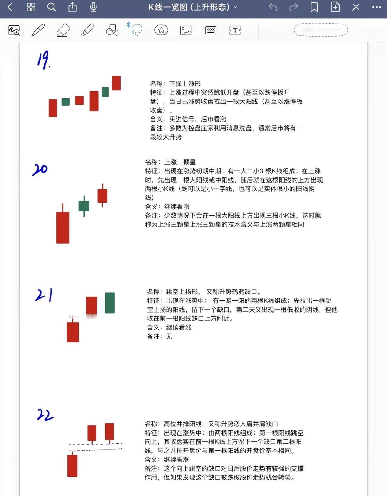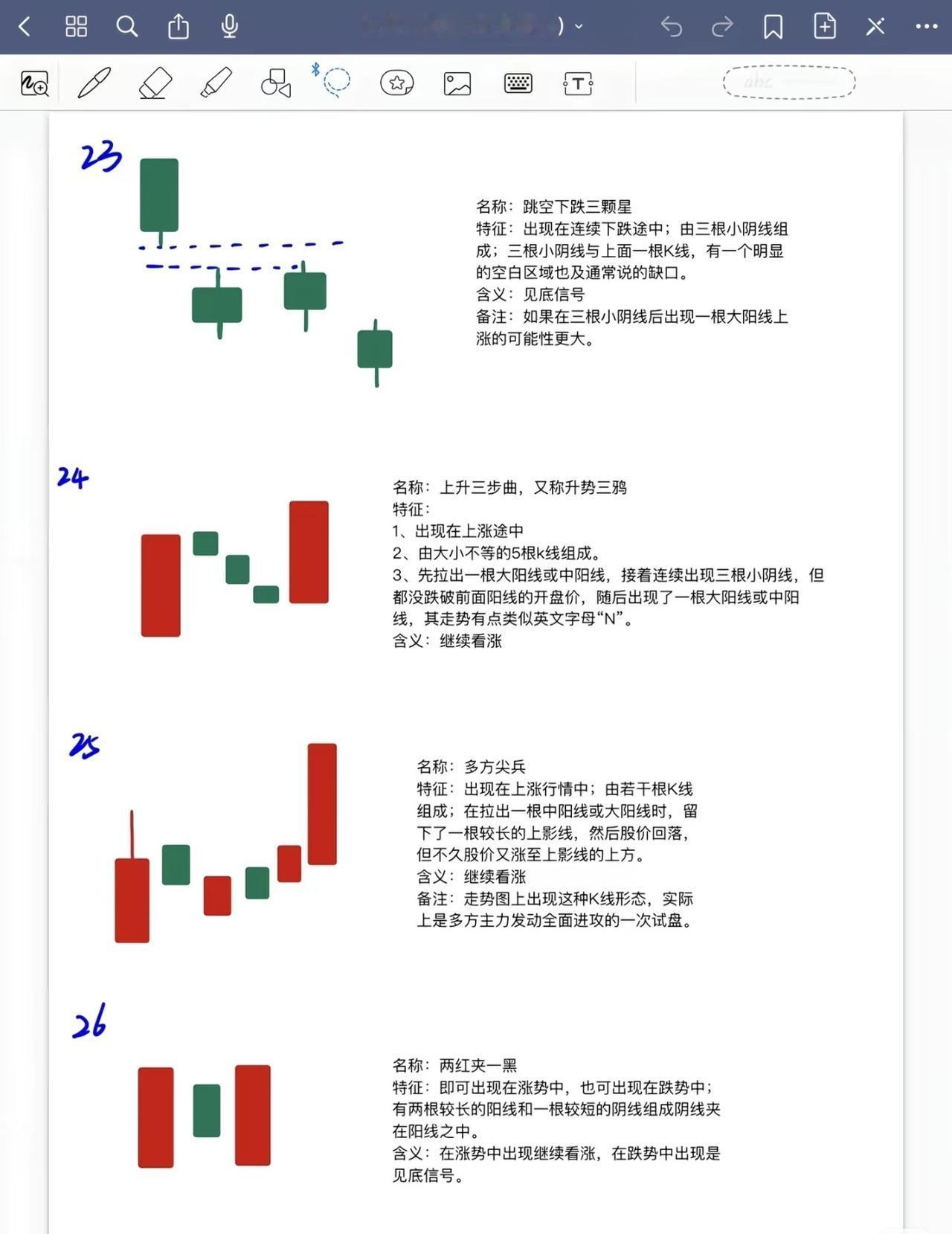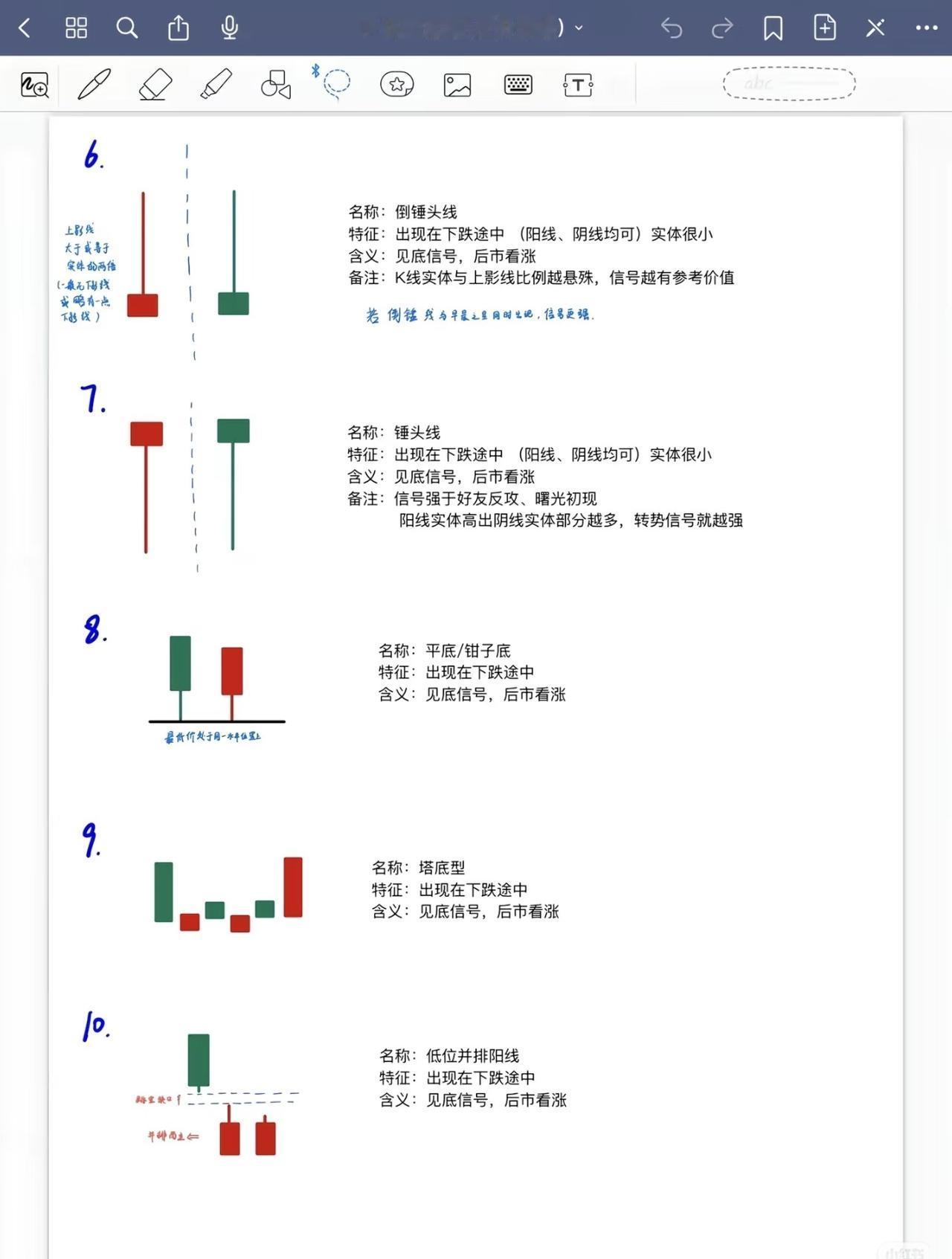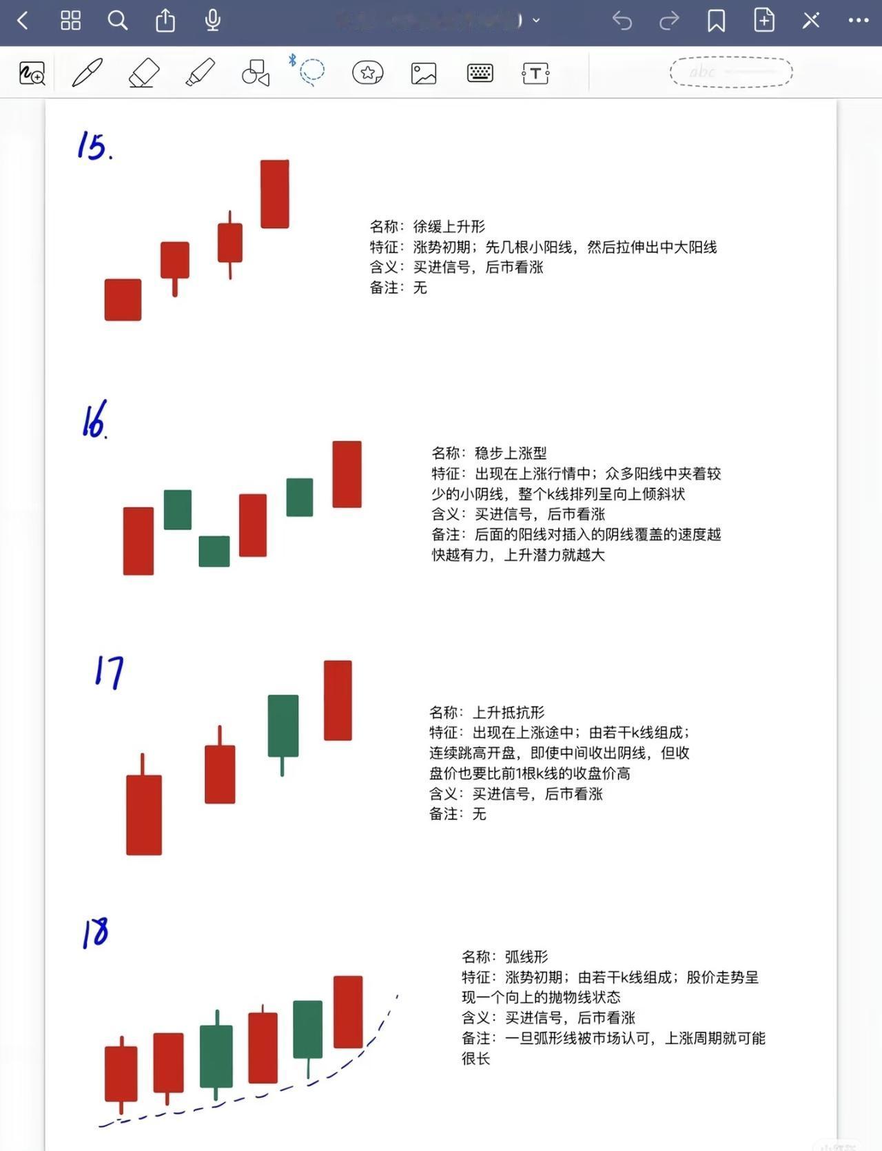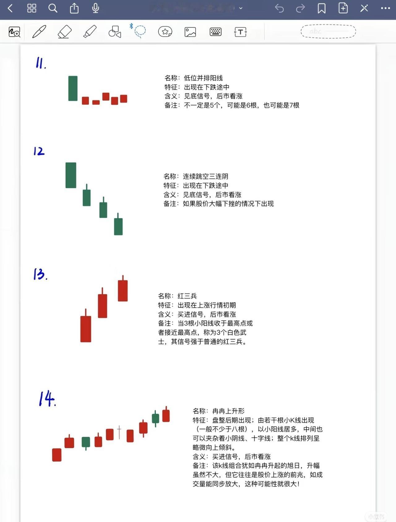 以下是对6张K线上升形态内容的系统总结,按形态类别及核心要点梳理: 一、下跌途中出现的见底看涨形态(1-12) 此类形态均出现在下跌趋势中,预示股价可能见底回升,信号强度因形态细节差异有所不同: 1. 早晨十字星/希望十字星:下跌途中出现,见底看涨信号最强。 2. 早晨之星/希望之星:下跌途中出现,见底看涨但信号弱于早晨十字星。 3. 好友反攻:下跌途中出现,见底看涨,转势信号弱于曙光初现。 4. 曙光初现:下跌途中出现,阳线实体深入阴线越多,转势信号越强。 5. 旭日东升:下跌途中出现,阳线高出阴线越多,信号强于好友反攻、曙光初现。 6. 倒锤头线:实体小,上影线≥实体2倍(可阳可阴);实体与上影线比例越悬殊,信号越可靠;若与早晨之星同时出现,信号更强。 7. 锤头线:实体小(可阳可阴),信号强于好友反攻、曙光初现。 8. 平底/钳子底:下跌途中出现,见底看涨。 9. 塔底型:下跌途中出现,见底看涨。 10. 低位并排阳线(首次提及):下跌途中出现,见底看涨(第11项补充:不一定5根,可能6-7根)。 11. 连续跳空三连阴:下跌途中大幅下挫时出现,见底看涨。 二、上涨初期/盘整后期的买进看涨形态(13-14) 此类形态预示上涨行情启动或盘整后突破,需关注信号强度及量能配合: 12. 红三兵:上涨行情初期出现,3根小阳线收于最高点或接近最高点(称“三个白色武士”),信号强于普通红三兵。 13. 冉冉上升形:盘整后期出现,由≥8根小K线(以小阳为主,夹杂小阴/十字线)组成,排列略向上倾斜;如成交量同步放大,上涨可能性更大。 三、涨势初期的买进看涨形态(15-18) 此类形态标志涨势启动,需关注形态结构及市场认可度: 14. 徐缓上升形:涨势初期,先几根小阳线,后拉伸出中大阳线。 15. 稳步上涨型:上涨行情中,众多阳线夹少量小阴线,排列向上倾斜;后续阳线覆盖阴线速度越快越有力,上升潜力越大。 16. 上升抵抗形:上涨途中,连续跳高开盘,即使收阴线,收盘价仍高于前一根K线收盘价。 17. 弧线形:涨势初期,K线排列呈向上抛物线;一旦被市场认可,上涨周期可能很长。 四、涨势中继续看涨的形态(19-22) 此类形态出现在上涨过程中,预示趋势延续,需注意洗盘或缺口支撑: 18. 下探上涨形:上涨中突然跳低开盘(甚至跌停),当日以大阳线(甚至涨停)收盘;多为庄家洗盘,后市可能有较大升势。 19. 上涨二颗星:涨势初/中期,一大二小3根K线(大阳线后上方两根小K线);少数情况为“上涨三颗星”(大阳线上方三根小K线),技术含义相同。 20. 跳空上扬形(升势鹤鸦缺口):涨势中,先跳空阳线留缺口,次日阴线收在缺口上方附近。 21. 高位并排阳线(升势恋人肩并肩缺口):涨势中,两根阳线第一根跳空,第二根并排开盘;缺口有支撑作用,跌破则走势转弱。 五、特殊见底/延续看涨形态(23-26) 此类形态结构独特,需结合缺口、排列等细节判断信号: 22. 跳空下跌三颗星:连续下跌途中,大阴线后接三根小阴线(与上方K线有明显缺口);若后续出现大阳线,上涨可能性更大。 23. 上升三步曲(升势三鸦):上涨途中,由5根K线组成(大阳线→三根未破阳线开盘价的小阴线→大阳线),走势类似“N”型。 24. 多方尖兵:上涨行情中,大阳线带长上影线后回落,不久涨至上影线上方;为多方的试探性进攻。 25. 两红夹一黑:两阳夹一阴(阴线较短);涨势中出现继续看涨,跌势中出现见底信号。 总结:所有上升形态围绕“见底”或“延续上涨”展开,核心关注形态出现的位置(下跌/上涨阶段)、K线组合细节(如实体长度、影线比例、缺口)及量能配合(如冉冉上升形需成交量放大),信号强度随形态特异性(如早晨十字星>早晨之星)和市场认可度(如弧线形)有所差异。