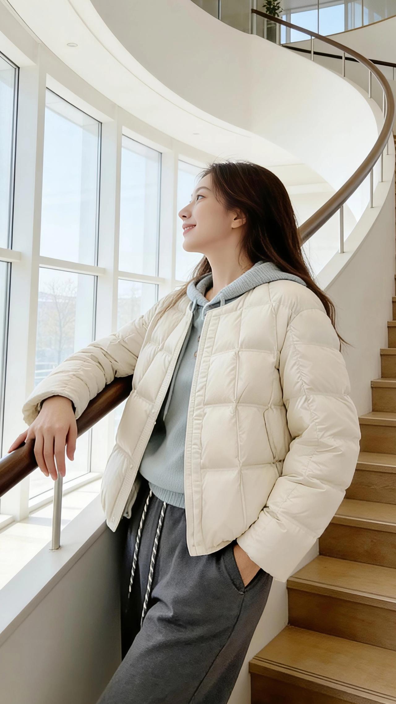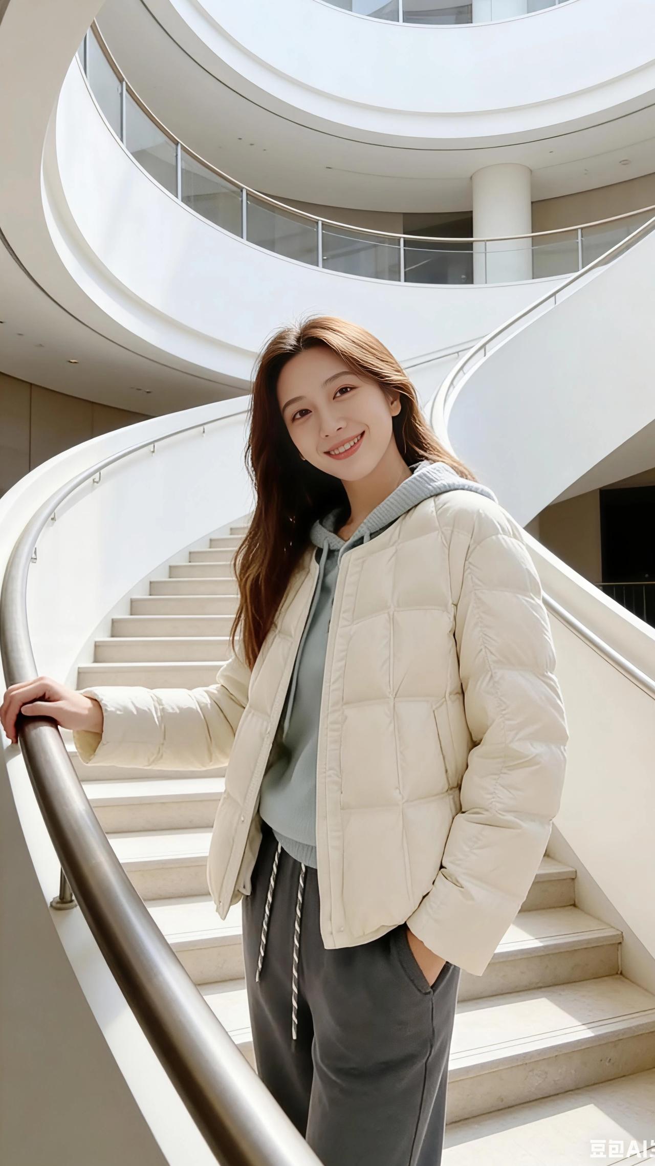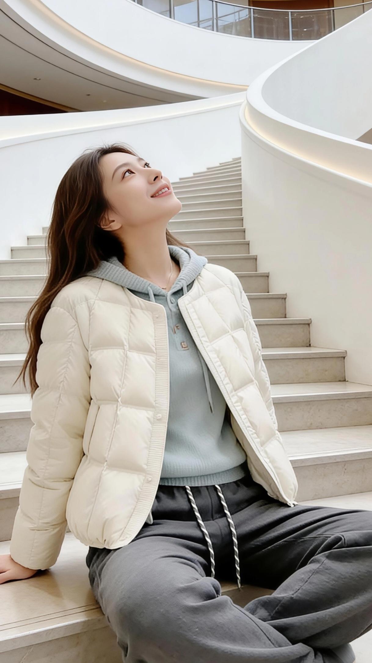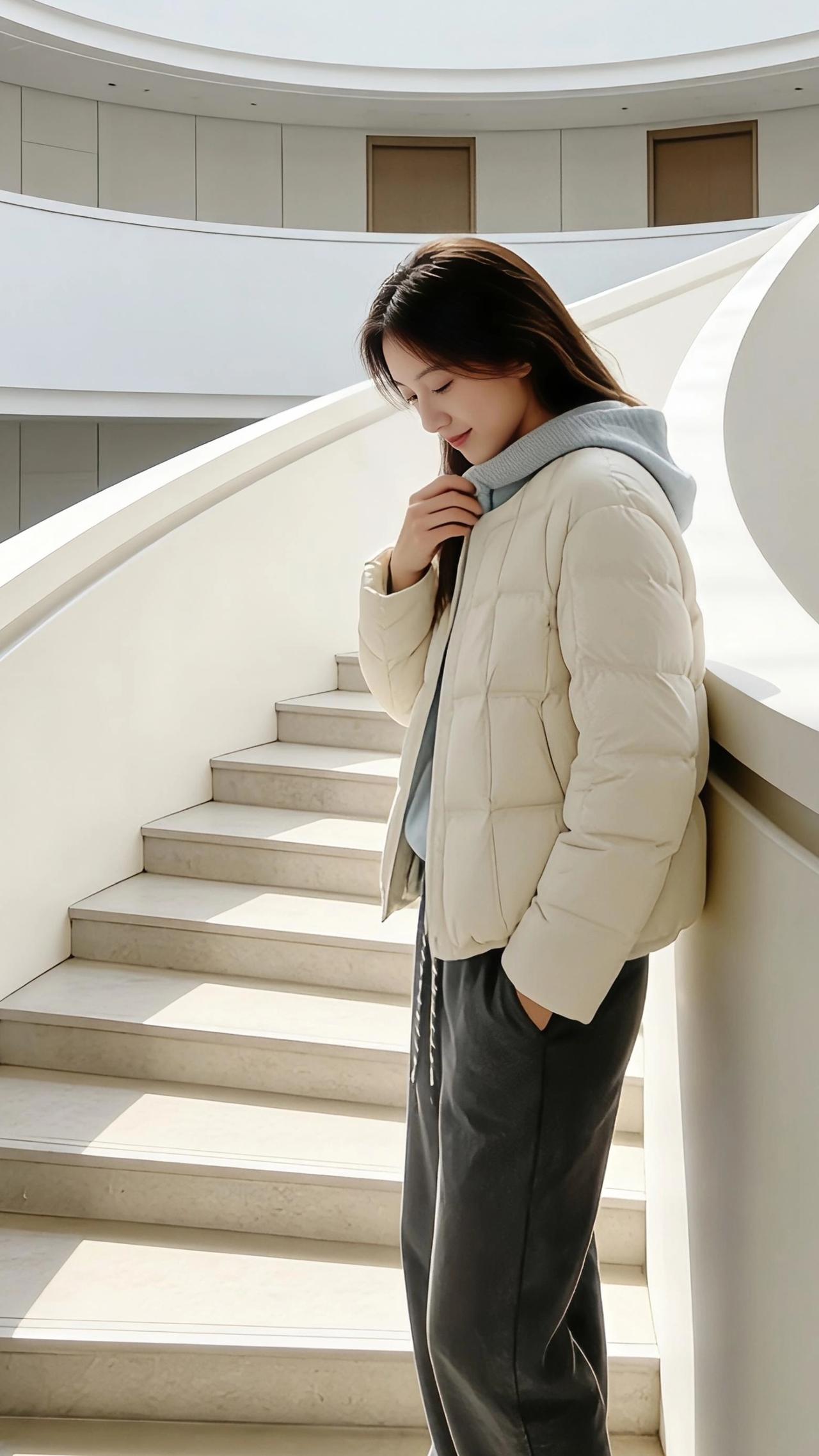 光沿着旋转楼梯的弧线淌下来,裹着她米白外套的软蓬褶皱——像把春天的云揉进了冬衣里。 她指尖搭在金属扶手上时,日光在浅蓝连帽衫的领口跳了跳,连松垮的灰裤绳都浸着温软的亮。坐下来时,发梢垂在肩线,仰头的弧度里,楼梯阶的光影叠成了轻缓的诗行。 走起来就更生动了:衣摆随着脚步晃出蓬松的弧度,像抱着一团会呼吸的暖。后来她靠在廊边,指尖碰了碰帽檐,风裹着窗外的光钻进来,把她的笑揉进了建筑的留白里——连空气都软成了蓬松的云。 高级感穿搭 小个子穿搭 冬季穿搭 棉衣棉服