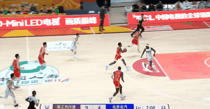 第一节比赛,桑普森反击接球飞身上篮打进,广厦开局11-4打停北京。