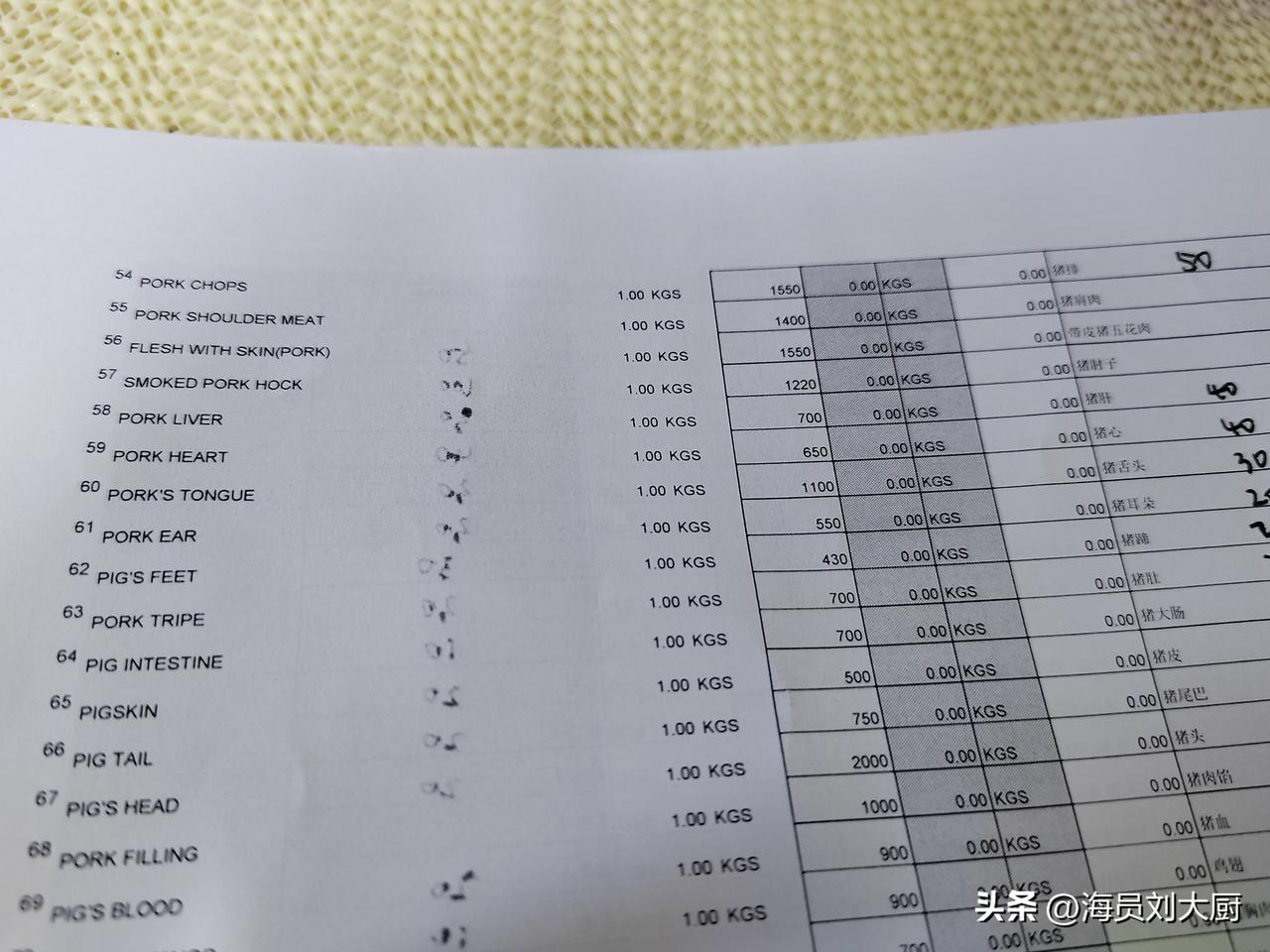日本的伙食单子发到船上来了,领导让我申请两个月的伙食,我仔细的看了看,日本的伙食
