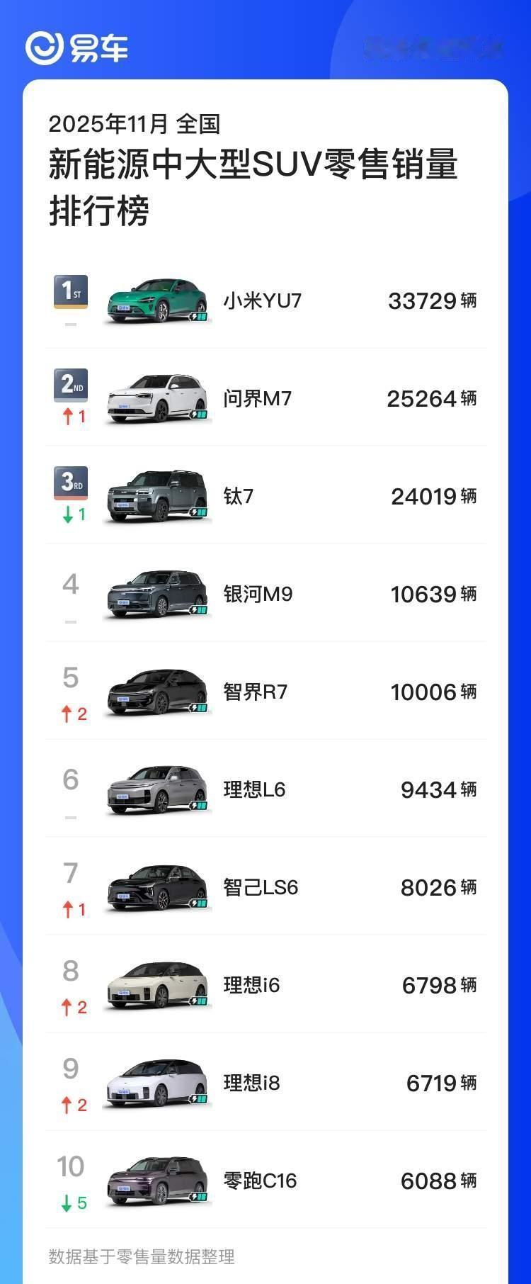 「11月零售端销量盘点」,有些统计逻辑还是有歧义,参考着看吧。 -品牌榜,综合了「五界」的鸿蒙智行登顶,但是自有三个品牌的蔚来却没上榜; -中大型SUV,小米YU7第一,线下竞品Model Y是47132台;这里其实可以看一下理想i6和i8的销量,都在缓慢增长; -MPV,高山继续领跑,梦想家紧随其后,D9有点儿走下坡路的趋势。【来自懂车帝车友圈】