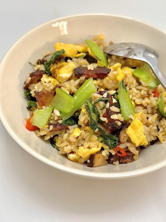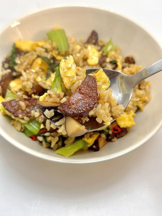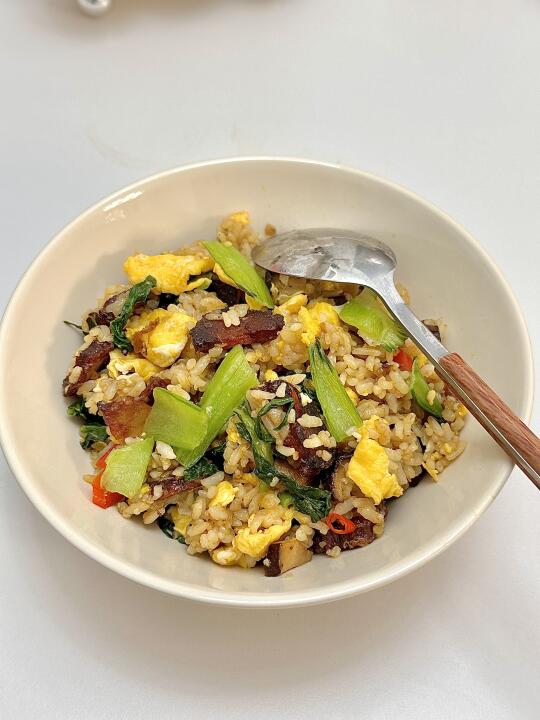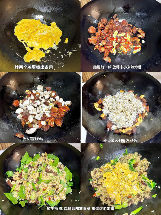 干香麻辣的腊肠配米饭炒简单好吃😋再加上青菜香菇吃起来没有油腻感 这碗饭真的绝了! 🥬食材:腊肠,香菇,米饭,青菜,鸡蛋 👩🏻🍳做法 1️⃣两个鸡蛋炒熟盛出备用 2️⃣腊肠煎下放蒜末 葱炒香 加入香菇 3️⃣放入剩米饭🍚加生抽 盐 鸡精调味 4️⃣加青菜和鸡蛋翻炒均匀出锅