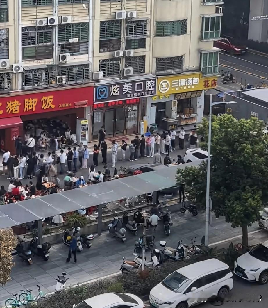 都来深圳打工吧,吃不完的猪脚饭 深圳昌记隆江猪脚饭的队,我直接看傻了——下午一点多,那队排得绕着门店拐了弯,电动车挤得路都堵了,一群穿工服的大哥大姐攥着手机在太阳底下搓手,就等那碗卤得油亮的猪脚饭。 这哪是吃饭?是打工人的“续命仪式”啊!15块左右一碗,猪脚炖得脱骨,浇上卤汁拌米饭,一口下去能扛一下午的活儿。有人说“不就是碗快餐”,但在深圳,它是写字楼里的“能量包”,是城中村的“安慰剂”——累到不想说话时,蹲在路边扒完这碗,才算把魂儿捡回来。 可评论区吵翻了:有人说“外卖吃着一般,排队纯跟风”,有人喊“这是深圳独有的烟火气”。 你们说:这种排队一小时的“打工人食堂”,到底是真好吃还是凑个热闹?