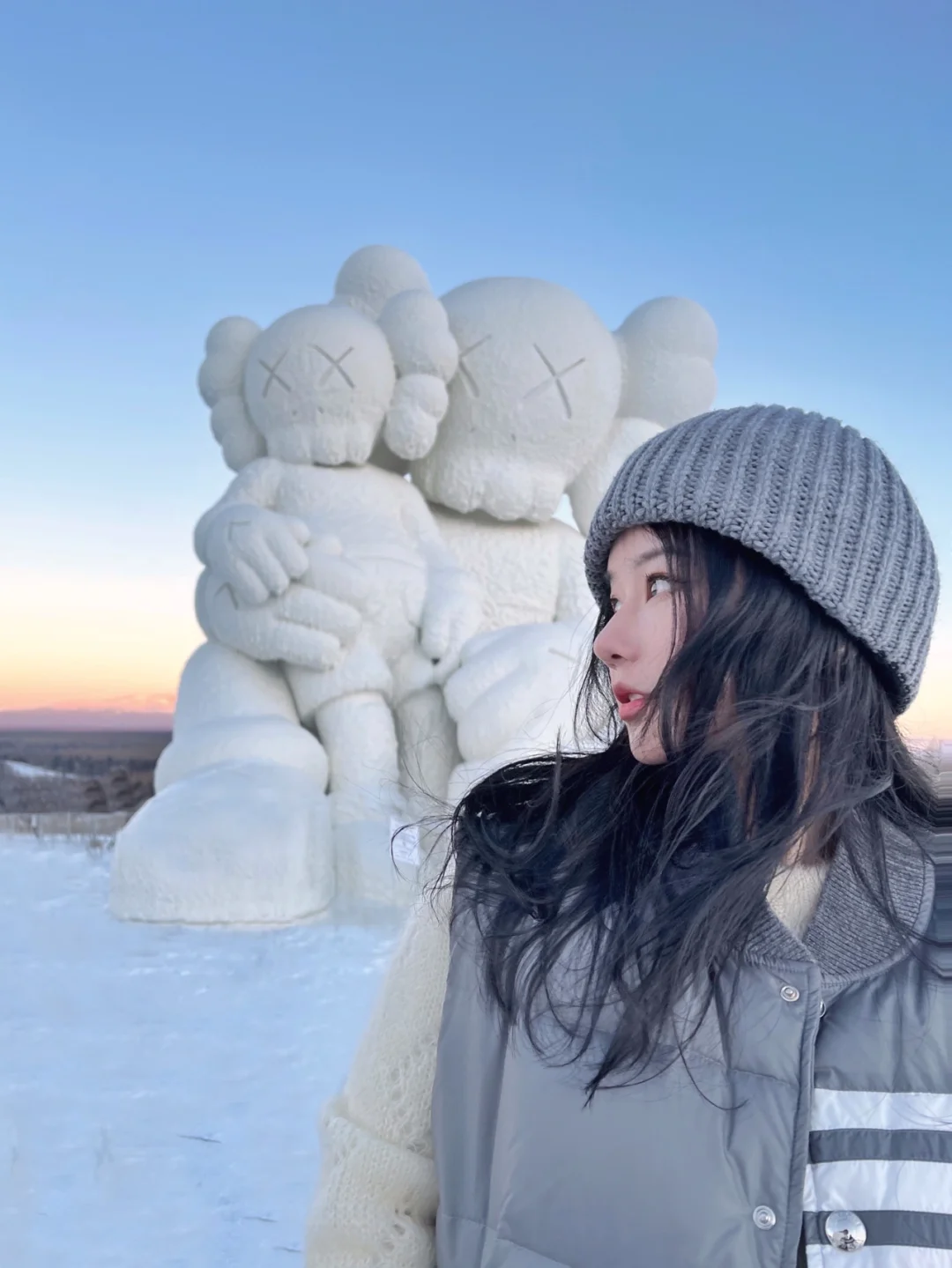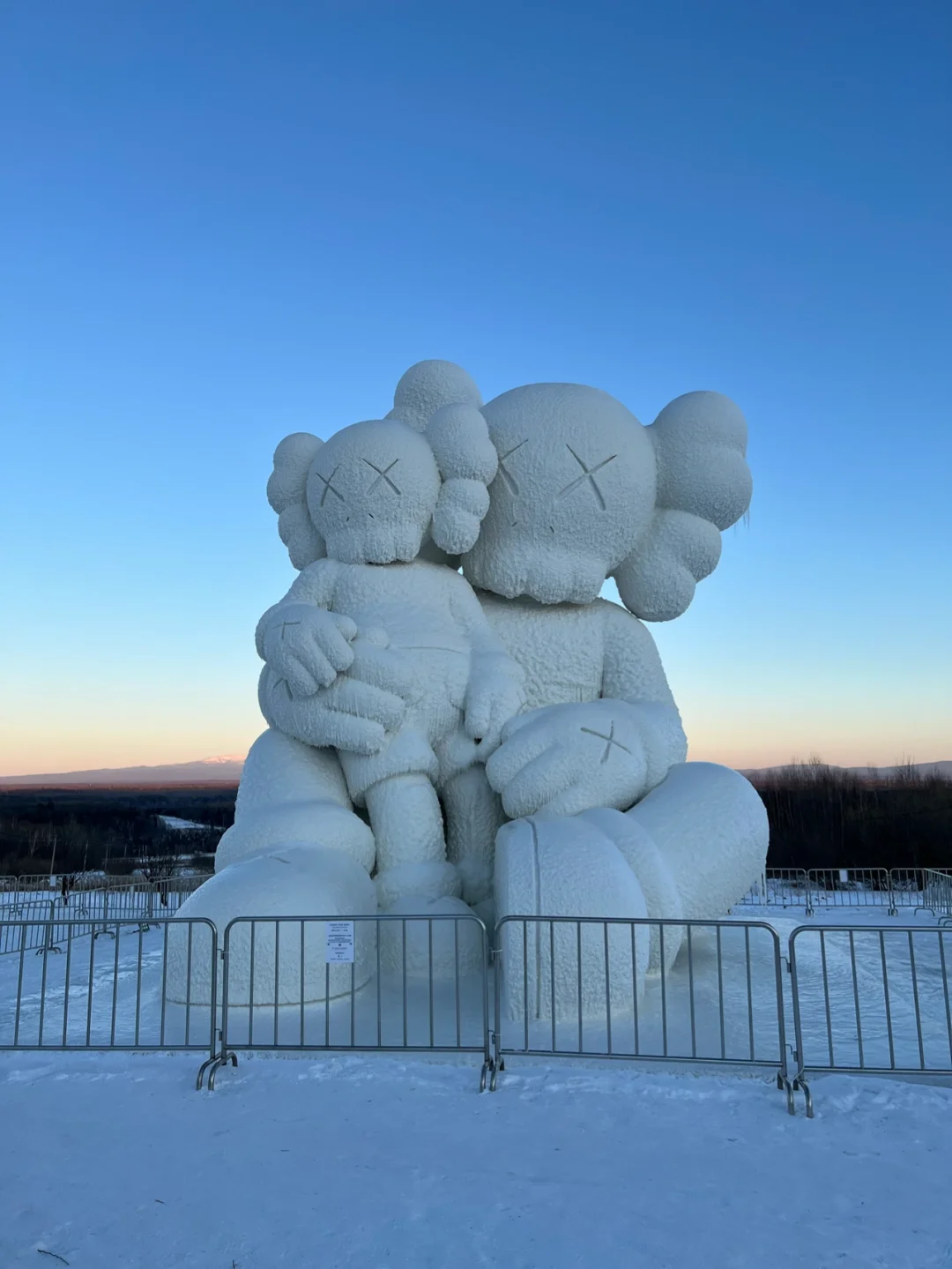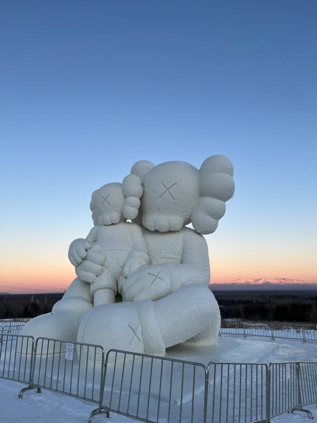 一对形态不一的 COMPANION 雪雕席地而坐