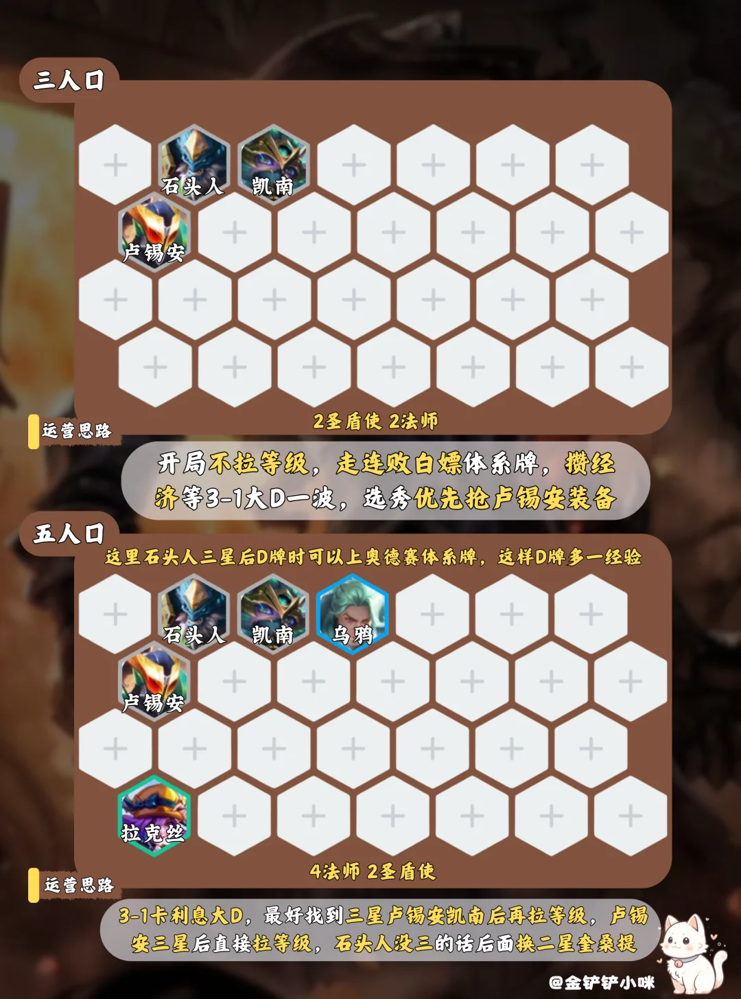 3️⃣阶段3-1大D找三星卢锡安 凯南 石头人,卢锡安三星后不管别人直接拉等级,石头人没三的话后期换成二星奎桑提