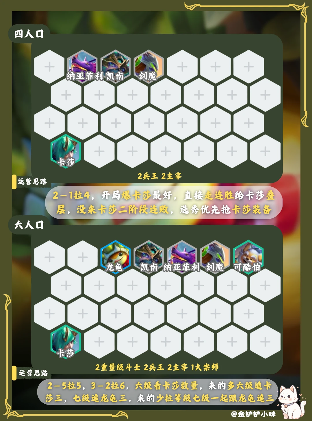 3️⃣阶段3-2拉6,六级卡莎来的多就六级追三,七级追三星龙龟,来的少就3-5左右拉7,七级一起追三星卡莎龙龟