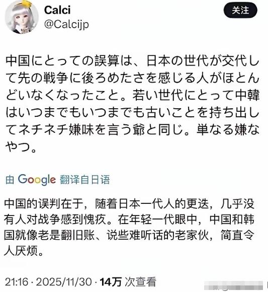 告诉你一个真实的日本! 近日,日本网友竟这样说:中国误判日本了,日本的年轻一代,几乎没有人对日本过去的侵略战争感到愧疚,在这些年轻一代的日本人眼中,中国和韩国老是在翻旧账,简直令人厌烦。 日本现在中学用的历史教科书,跟咱们小时候看的可大不一样,比如南京大屠杀,咱们课本里写得明明白白“日军杀害30万平民”,可日本新版教科书里,这事儿被改成了“涉及导致大量伤亡的事件”——“杀害”变“涉及”,“30万”直接模糊成“大量”。 更绝的是,他们把侵华战争的起因,从“军国主义扩张”改成了“为了摆脱经济危机”,甚至用“进出中国”这种词,把侵略说成“去别人家做客”。 更离谱的是,他们花大篇幅讲广岛、长崎被原子弹炸,讲东京大空袭、冲绳战役,把自己塑造成“战争最大受害者”。 日本有个调查,60岁以上的老人,超过一半承认侵华战争是错的;可20到39岁的年轻人里,只有四成这么想,更夸张的是,18到25岁的年轻人,六成觉得“战争责任早就用钱赔清了”。 为啥差距这么大?因为老一辈经历过战争,知道军国主义有多可怕;可年轻人出生在和平年代,没挨过打,没流过血,历史对他们来说,就是课本上的几行字。 再加上日本流行文化里,战争被包装得特别“酷”,比如有个超火的策略游戏,把侵华日军将领写成“为了保护东亚文明,被迫打仗的英雄”,年轻人天天玩这种游戏,看这种动漫,自然觉得战争没那么坏。 日本现在当官的,右翼势力特别强,首相高市早苗,三天两头去靖国神社拜鬼,她手下的人还公开质疑之前的道歉声明,说“那都是过去的事了,现在没必要再提”。 更过分的是,他们把历史问题和现在的安全焦虑绑在一起,天天炒作“中国核威胁”“钓鱼岛要被抢了”,然后说,为了保护日本,我们得加强军备,甚至得考虑造核武器。 可实际上呢?日本偷偷攒了47吨分离钚,够造6000枚核弹头;自民党还在讨论修改“不运进核武器”的规定,想让美军把核弹搬到日本来。 这种“一边装和平,一边扩军”的套路,既转移了国内对经济不行的注意力,又让年轻人觉,我们这么做是为了自保,不是侵略,所以历史问题早就解决了。 说到底,日本年轻人对历史的模糊认知,是教育、文化、政治三方面一起“捣鬼”的结果,但历史哪能随便改?德国把纳粹历史写进宪法,禁止否认大屠杀;波兰每年都纪念华沙起义,让年轻人记住战争的苦。 日本一边删教科书里的侵略史,一边把自己塑造成受害者,这种“掩耳盗铃”的做法,只会让邻国更不信任。 日本教科书把侵略战争改得面目全非,“杀害”变“涉及”,“30万”变“大量”,这不是睁眼说瞎话吗?更过分的是,把自己塑造成受害者,天天讲被原子弹炸、被空袭,好像战争全是别人挑起来的。 这种教育下,年轻人哪能知道当年日本军国主义有多残忍?他们觉得战争就是游戏里的打打杀杀,是“英雄”的冒险,这认知能不出问题吗? 政客们也没起好作用,三天两头参拜靖国神社,还炒作“中国威胁”,说要扩军造核武器。 这不是明摆着告诉年轻人:“我们没错,现在这么做是为了自保,”可实际上呢?日本偷偷攒那么多核材料,想干啥大家心里都清楚,这种“一边装可怜,一边搞小动作”的做派,能让人信服吗? 咱中国“翻旧账”,不是为了报复,是想让日本记住:战争带来的只有痛苦和毁灭,咱们得让日本年轻人知道,他们现在能安安稳稳上学、工作,是因为前辈们用血肉之躯挡住了侵略。 历史不是橡皮泥,不能想咋捏就咋捏,只有正视过去,承认错误,才能赢得尊重,才能和邻国和平相处。