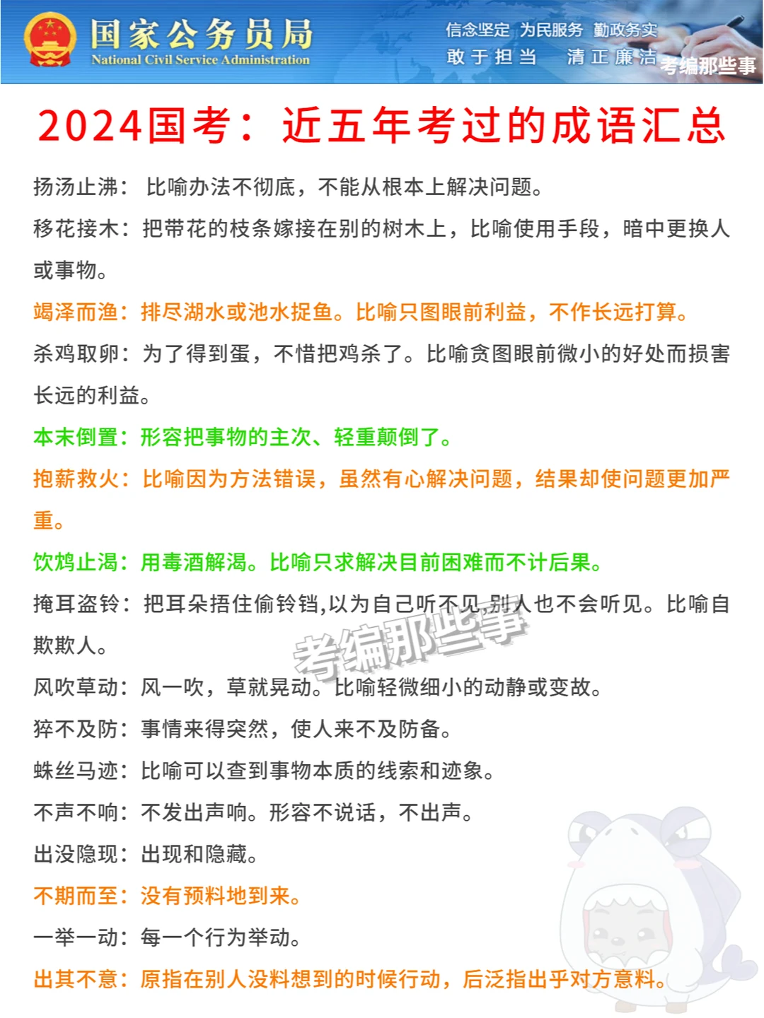 近五年国考-考过的成语汇总(篇幅有限),绿色字体代表“考过3次或3次以上”,橙色字体代表“考过2次”