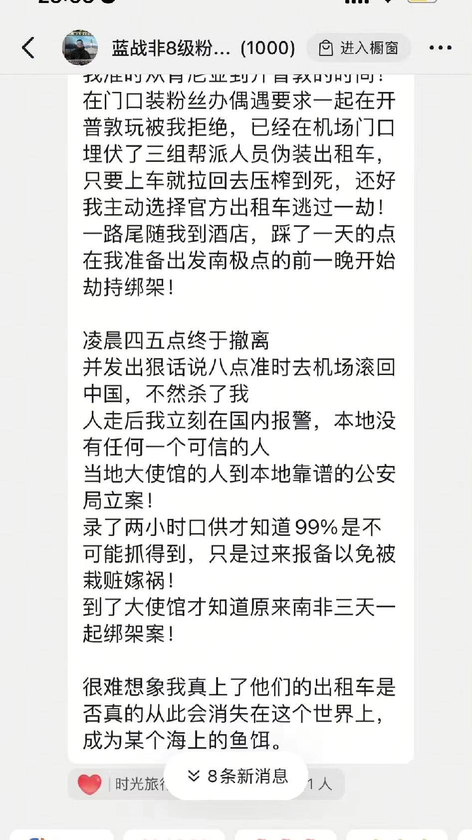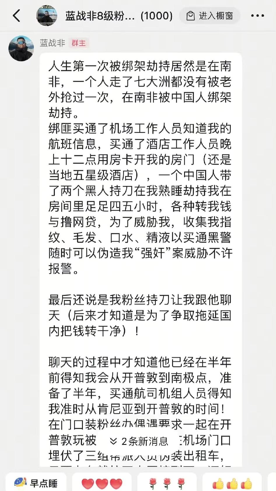 震惊!蓝战非自述第一次被绑架,在南非,还是被同样肤色的中国人挟持!通过这件事,想想都细思极恐,也同时警醒了所有人! 为什么在海外劫持的是中国人,而不是外国人?原因只有一个,那就是只有中国人了解中国人,经常玩手机的都知道网红有钱,更何况是打网游直播的蓝战非,太出名了,年纪轻轻早就财富自由了。 所谓人怕出名猪怕壮,就算是在海外探险,长相打扮普通,外国人可能不认识,但中国人了解的很,尤其是一边探险一边直播,露脸机会越多,离危险就越近!而且海外治安那么差,不可能像在国内那么有忌惮,就算报jing,科技又不是很发达,要找到作案人是很难的 绑架蓝战非的中国人,一看就是很有经验,轻车熟路,明显是按照“仙人跳”挟持作案的。就常盯着独自旅行的,有知名度,住高端酒店,吃喝自由的中国人,尤其是经常直播露脸的网红! 幸好的是,蓝战非是安全的,没有要害他性命。所以在海外一定要低调,不要让自己在网上经常露脸,更要记得,海外探险的地方,一定是充满危险重重,不要带侥幸心理,现在安全最重要! 南非绑架 蓝战非旅游记录