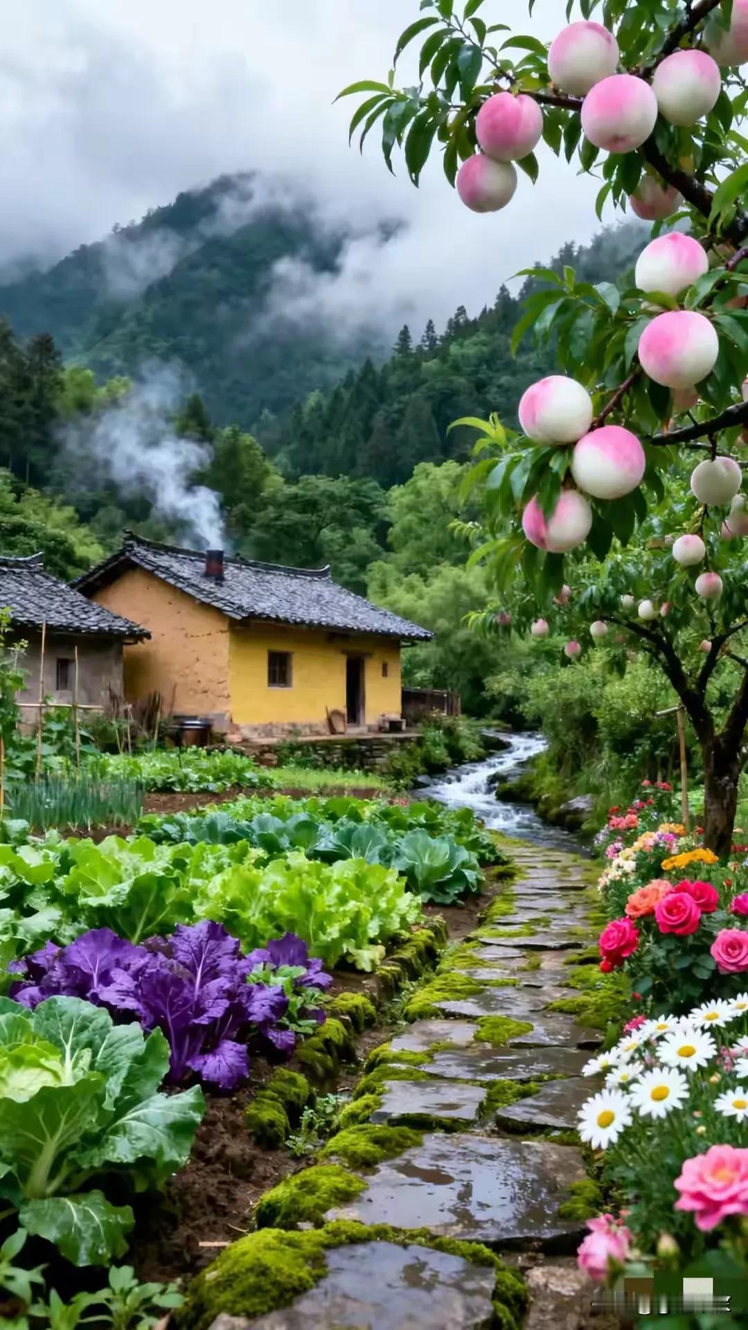 上联:桃枝挂露香沾院 下联:炊烟渺渺农家乐