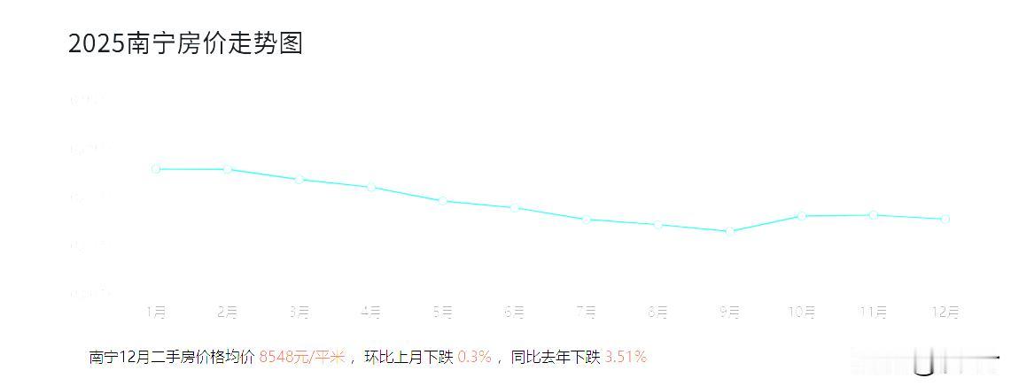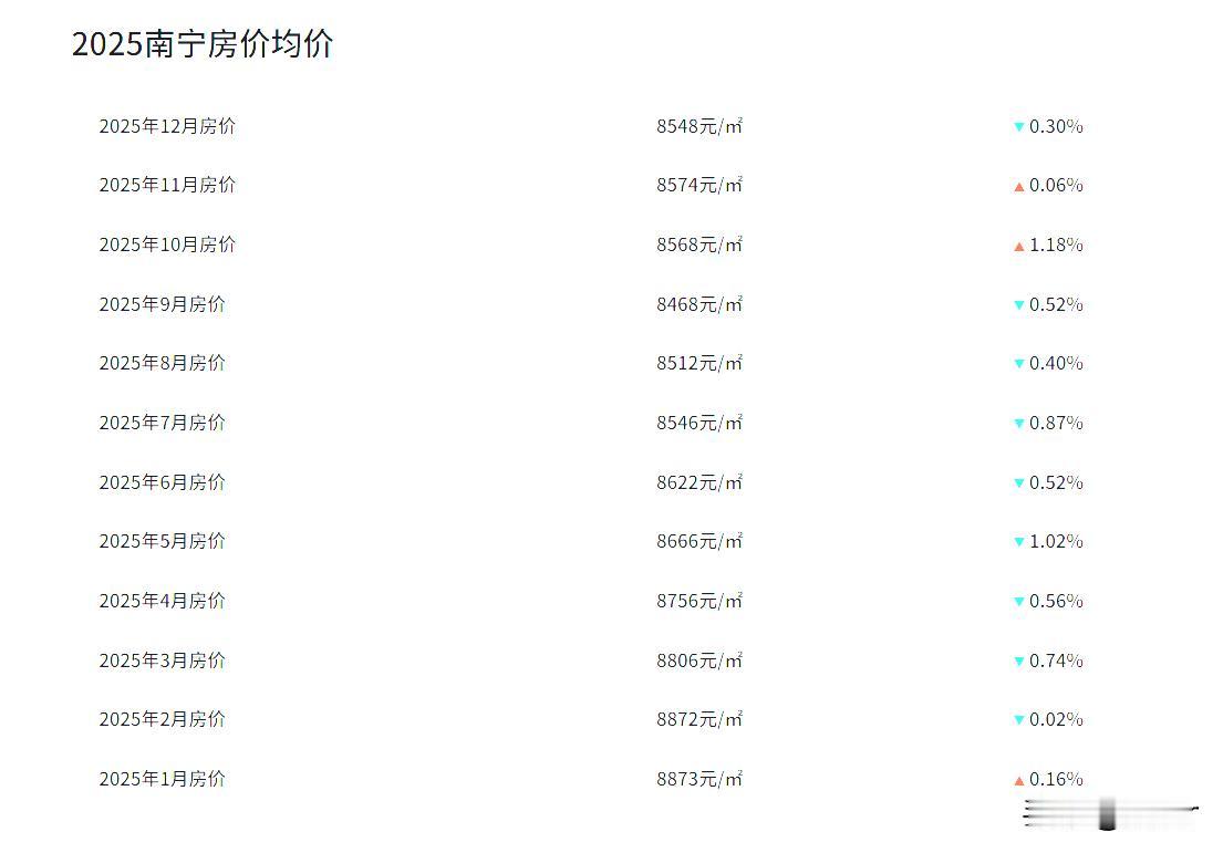 2025年1月,南宁房价均价8873元; 2025年2月,南宁房价均价8872元; 2025年3月,南宁房价均价8806元; 2025年4月,南宁房价均价8756元; 2025年5月,南宁房价均价8666元; 2025年6月,南宁房价均价8622元; 2025年7月,南宁房价均价8546元; 2025年8月,南宁房价均价8512元; 2025年9月,南宁房价均价8468元; 2025年10月,南宁房价均价8568元; 2025年11月,南宁房价均价8574元。 2025年1月至11月,南宁房价微跌约300元,和南宁房价最高的2021年11月的11121元比较,已经下降了约2547元,平均一年下降约600元。漫心r在整理南宁房价数据时发现南宁的房价数据和太原的房价数据差不多。涨幅趋势也差不多。 2025年前三季度,南宁全市GDP4688.69亿元,同比增长4.2%。2024年末,全市常住人口为897.19万人,比上年增加3.11万人。从GDP和人口来看,南宁还是优于太原的,太原2025年前三季度,全市GDP3816.49亿元,同比增长1.3%。2024年末,全市常住人口为551.47万人,比上年增加6.03万人。 未来,南宁的房价主要还是和经济、人口等因素成正相关,可以确定的是,一定不会出现之前的暴涨暴跌。 以上房价均价数据是参考安居客平台数据,只作为数据分析使用,实际不同区域不同地段的房子价格有显著差异。 那么对于南宁的房价均价来说,大家觉得应该在哪个区间比较合适呢?