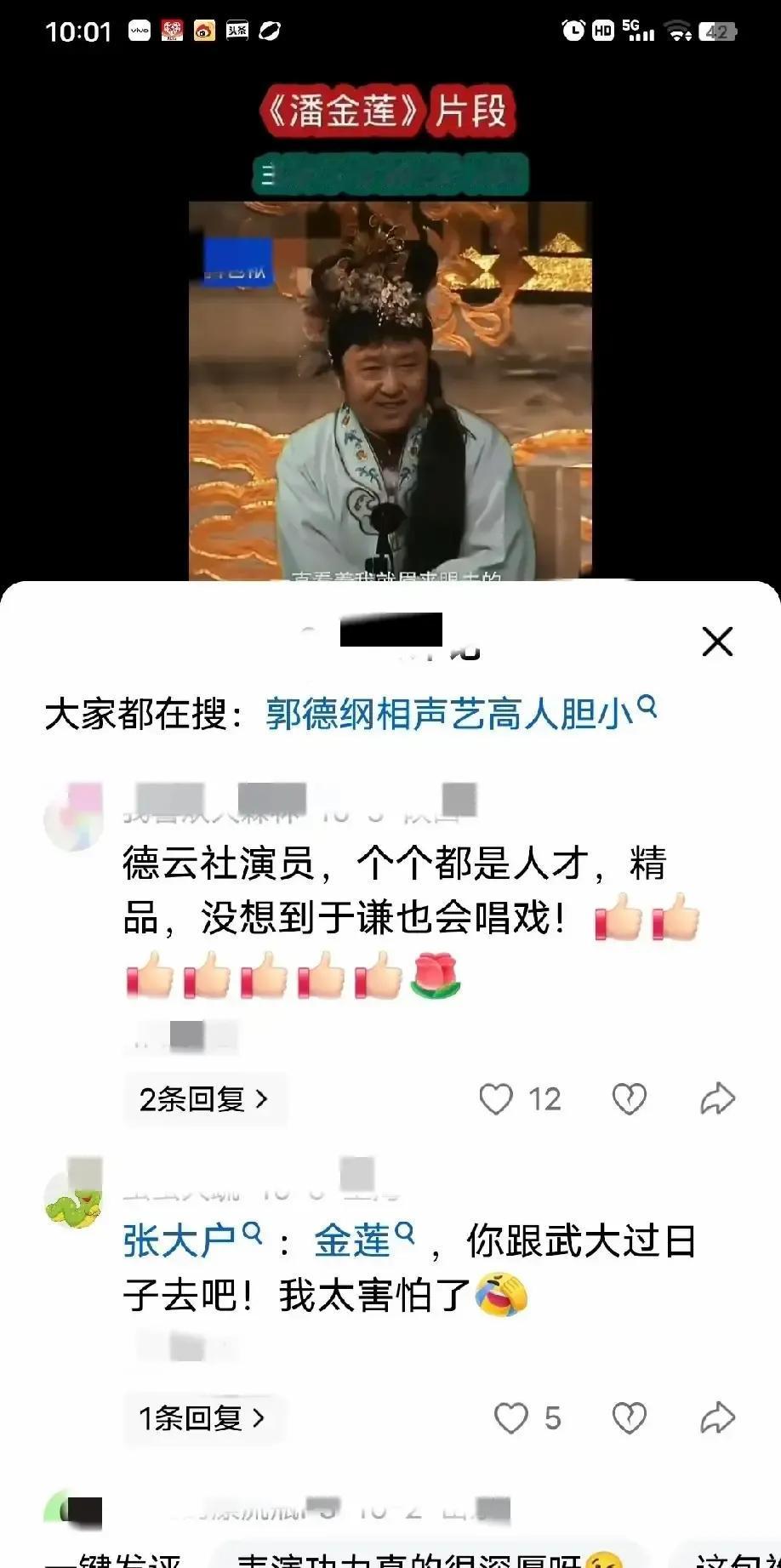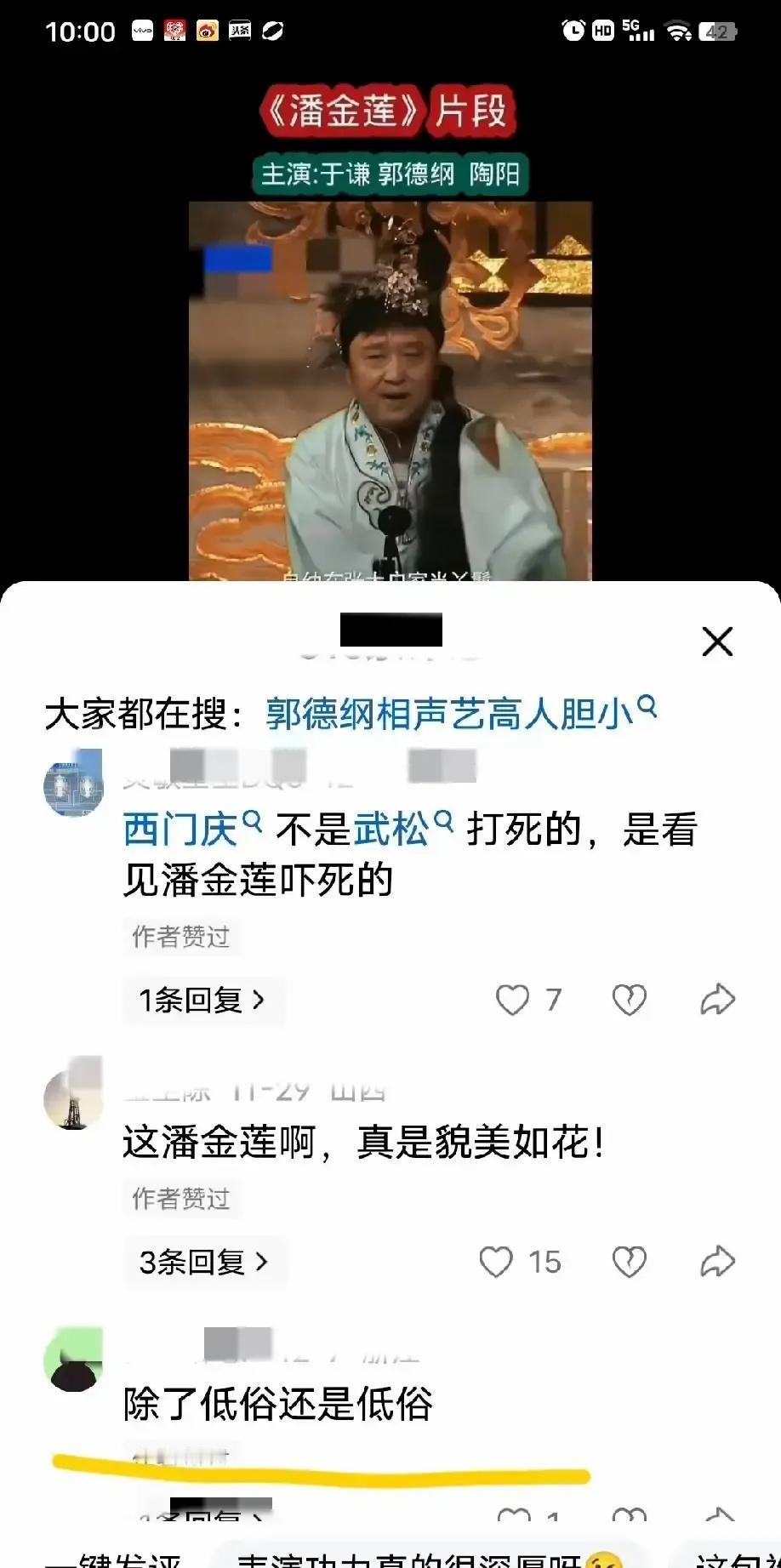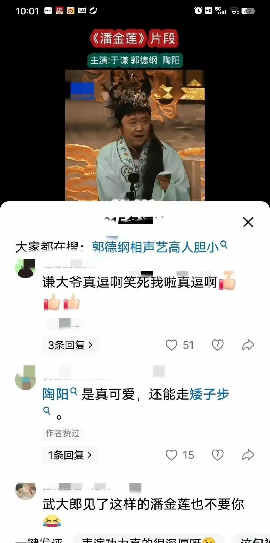于谦扮潘金莲冲武大郎甩了句“我嫌他小”,台下哄笑,视频一夜冲上百万播放。 德云社后台回媒体“正常舞台互动”,于谦本人没道歉,只在下一场自嘲“一句话能写部史记”网友立马劈成两派,一边护“老包袱别玻璃心”,一边骂“拿身高开黄腔太低级”我看了直皱眉,相声再图乐,也不非得把身材羞辱当笑点,潘金莲嫌夫矮原本就是旧社会槽点,搬到今天还当爆梗,真挺没劲。 喜剧好笑不等于可以随便踩人,观众笑过还能留点尊重,才算高级。