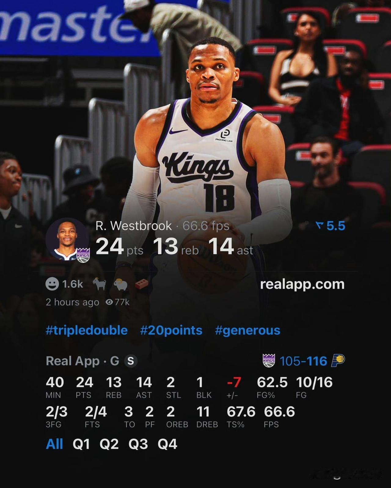 威少选择在国王队退役吧! 今天,国王队以105-116不敌步行者队。虽然输球,但威少表现不俗,他全场得到24分13篮板14助攻,拿下了职业生涯的第207次三双,继续刷新着属于独属于自己的历史记录。 要知道,威少目前仅仅是一个合同非保障的球员。谁能想到在威少职业生涯末期,竟然能在国王队收获了久违的尊重,获得了充足的上场时间和战术地位。士为知己者死,威少完全可以选择拿低薪合同继续为国王队效力,然后在这里结束自己的职业生涯,将最后的余光奉献给国王队,也能为自己的传奇生涯画上一个完美的句号。