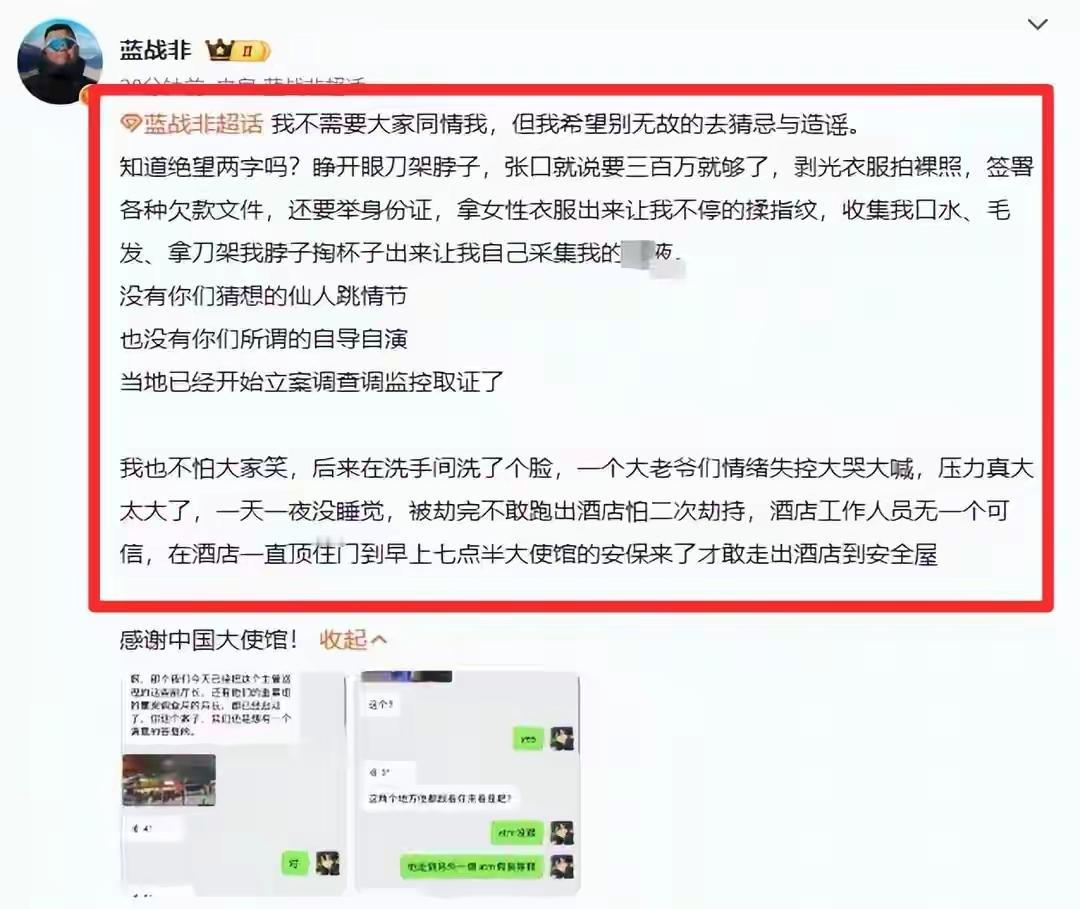 说句大实话, 蓝战非被绑架, 我一点也不意外, 可以说是意料之中。 老祖宗说财不外露,富不露相,蓝战非把家底都透出来了,不但全国人民都知道了,全世界都知道了。 前段时间蓝战非自曝努努力一年可以挣个小目标,刺痛了多少人的神经,让多少人红了眼。后来就遭到了平台的处罚,禁止粉丝关注,接下来就在南非遭到了绑架。 绑匪为了绑架他,提前布局。买通机场人员,提前掌握他的行程,假装粉丝同行套取入住信息,买通酒店人员获得房门钥匙,一旦他出现就会成为待宰的羔羊。 幸运的是,身体没有收到伤害,只是损失些钱财和生物特征。 嚎啕大哭是后怕,是劫后余生,是教训,想必以后出行首先要考虑自身安全问题了吧。 能者多劳,能挣钱是本事,我们不眼红就怕有人眼红。