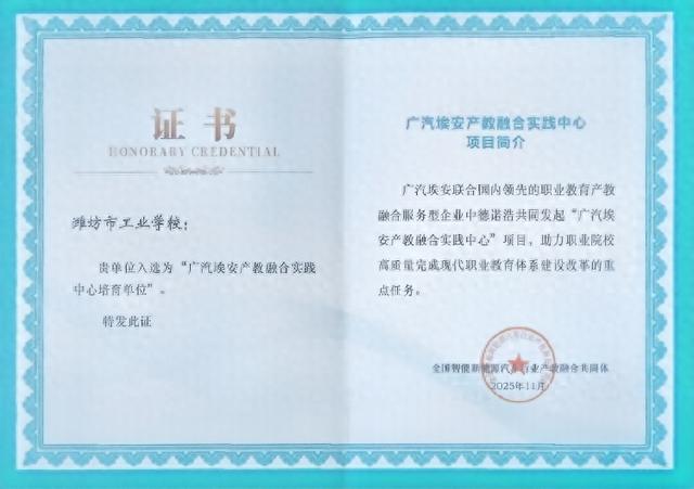 近日,潍坊市工业学校成功入选为“广汽埃安产教融合实践中心培育单位”。该项目由广汽埃安与国内领先的职业教育产教融合服务型企业中德诺浩共同发起,旨在推动智能新能源汽车行业与职业教育的深度融合,助力职业院校高质量完成现代职业教育体系建设改革重点任务。