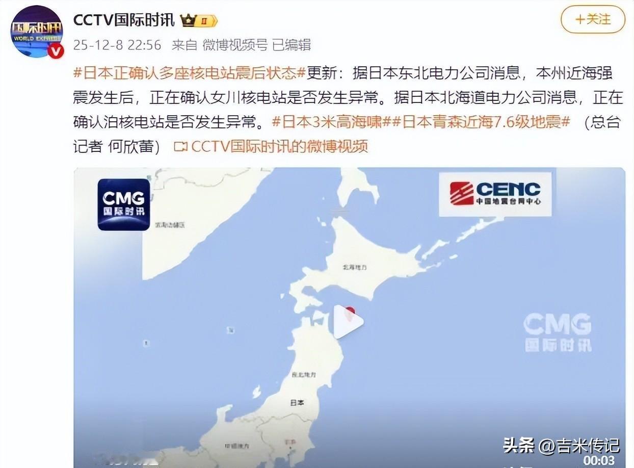 日本七级强震凌晨爆发,中国游客卫生间避险,核电站异常牵动人心。 12月8日晚11点多,日本青森县近海发生7.6级地震。气象厅预测3米海啸,北海道、青森等地紧急疏散。我在青森旅游的朋友徐女士说,房子突然剧烈摇晃,东西掉一地,她直接抱起证件躲卫生间。同一时间,北海道留学生也在家经历了持续震动,吓得往厕所跑。 地震预警响时,徐女士正待在一楼。电视马上开始播海啸警报,但她家离海边半小时车程,暂时没出去。青森屋酒店3层住的游客描述更吓人,整栋楼晃得停不下来,所有人都冲下楼。有人反映电子设备全在报警,电梯停运只能走楼梯。 神奈川县华人说,台灯摇晃了近一分钟,东西也倒了不少。东京两位网友也感到明显震动,大概持续一两分钟。东北电力公司立刻检查女川核电站,北海道电力公司也在确认泊核电站情况,目前还没发现异常。 NHK电视台直接中断节目播紧急通知,反复喊大家远离海岸。中国驻札幌总领馆发警告,让太平洋沿岸同胞赶紧避难,提醒海啸可能反复袭击。我表哥在仙台打工,当时刚吃完饭,手机警报声特别刺耳,他抓着包就往高处跑。 地震后日本政府开了紧急会议,各地方忙着统计损失。自然部说这次海啸不会影响我国海岸,但建议在日本的同胞还是提高警惕。青森县过了半小时又来5.6级余震,震感还能感觉到。 现在当地还在排查建筑隐患,很多商场超市都关了。我朋友在超市工作,货架全散了,员工连夜清货。北海道铁路部分停运,游客出城只能坐末班车。民宿老板叮嘱客人别睡太沉,说余震随时可能来。 气象厅把震级从7.2级上调到7.6级,说明能量更大。这次震源在海里,难怪会引发海啸预警。日本建筑抗震确实有功夫,虽然晃得狠但没见房子塌。不过卫生间的抗震设计被大家夸了,很多人躲那才没受伤。 现在网上满是各地方震动对比,青森抖得最凶,仙台稍轻。政府提醒别光顾着拍视频就往海边凑,有经验的老人都说浪头来得快。徐女士说今晚肯定不敢睡觉,手机音量调最大防着余震