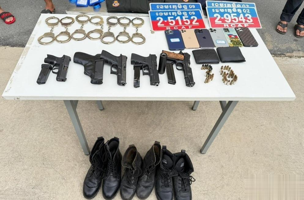 21日晚,柬埔寨金边市警方称,他们成功捣毁一伙假冒宪兵、专门勒索并绑架中国人的犯罪团伙,共抓获7名涉案男子,并查获多把枪械及作案工具。