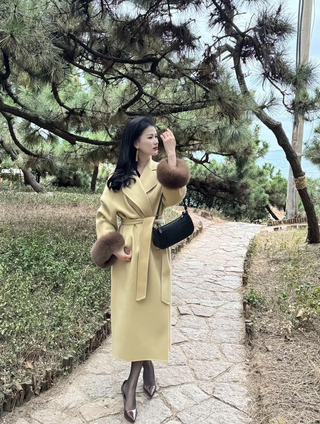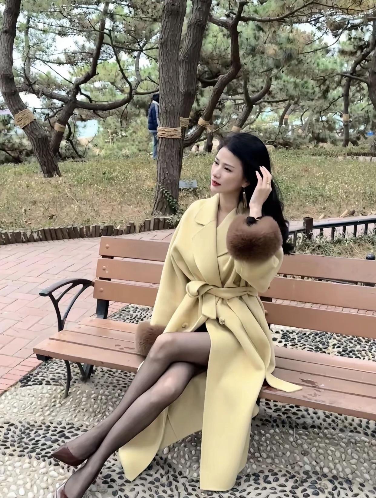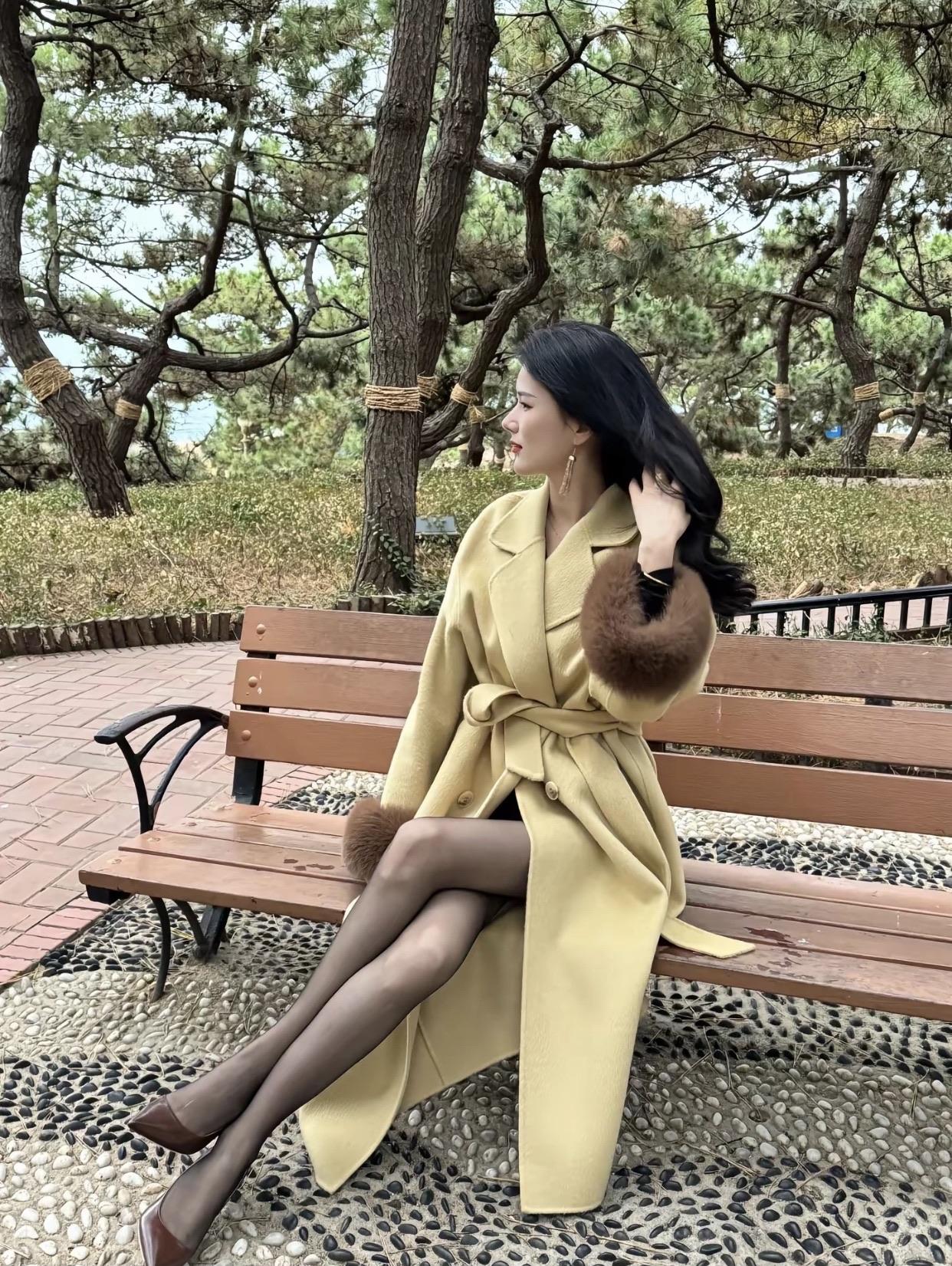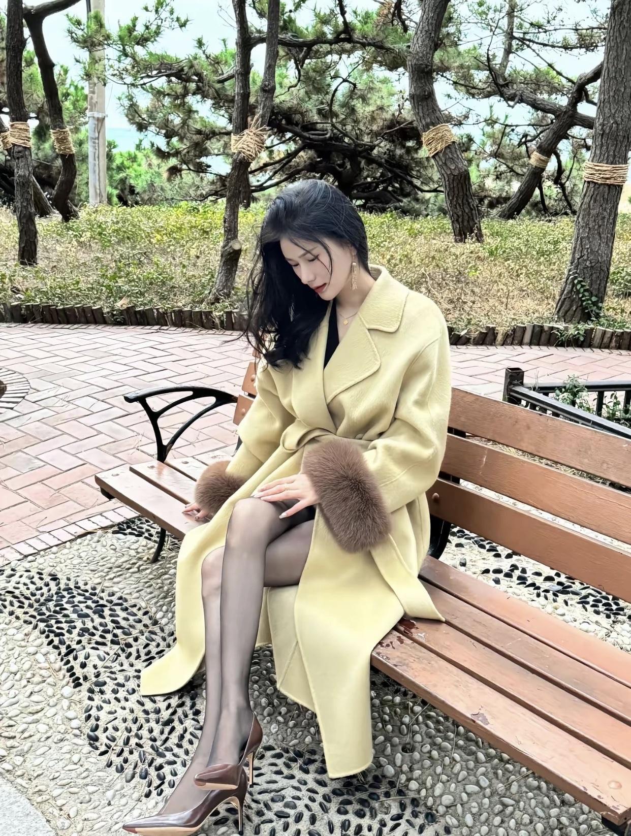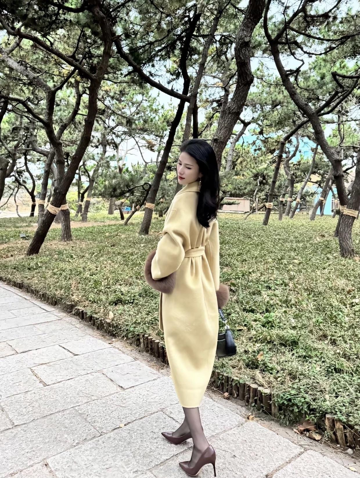 秋日穿搭指南:暖黄色大衣搭配棕色毛绒袖,优雅气质满满!🍂👗👠