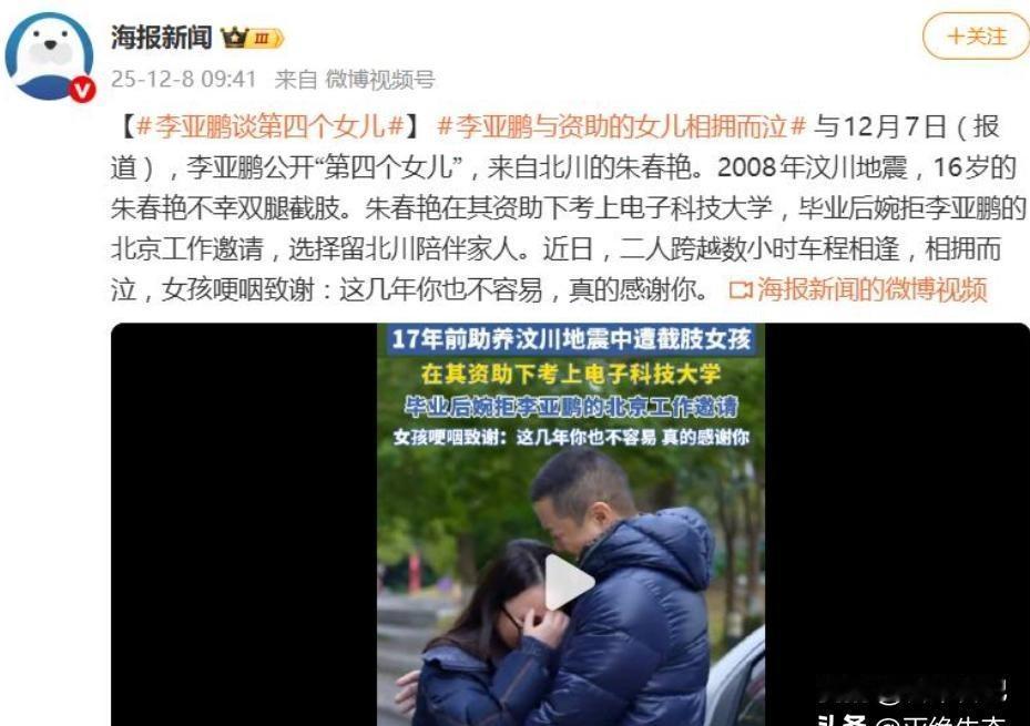 李亚鹏离婚后被网暴,神秘女儿竟藏暖心事,两个陌生人的羁绊让所有人沉默。 最近李亚鹏在社交平台发视频说有个“另一个女儿”,底下立马炸锅了。网友纷纷骂他是渣男,结果发现这女的根本不是亲生的。这姑娘叫朱春燕,十二年前汶川地震受伤差点截肢,当时李亚鹏和王菲做的慈善基金帮了她。 朱春燕后来跟着李亚鹏去北京治病,前后做了好多次手术。李亚鹏不仅出钱还当起了“父亲”,陪着她上学,甚至看她考上985都高兴。朱春燕工作后还给李亚鹏寄工资,说要帮他渡过难关。 这事曝光前大家对李亚鹏印象挺差的。他和前妻海哈金喜离婚时,俩人从大别墅搬到小房子都没吵吵嚷嚷。后来网友扒出他离婚前搬家没露面,直播卖货东西质量还不好,直接骂成负资产。可实际上这些年他捐了私立幼儿园,还资助过不少贫困家庭。 朱春燕现在逢人就感谢李亚鹏。上次李亚鹏去她老家看她,连见面都没提前说,视频里看得出来俩人都挺动情。网友这才反应过来,原来李亚鹏不是大家想象的那样。 他直播确实卖了不少低价货,但搞慈善全是自己掏腰包。投资失败后经济紧张还坚持帮助别人,有回他公开说“钱没了能再赚,良心失了就白活”。 离婚后海哈金喜一直没说过他的坏话。当初俩人搬东西都是亲戚帮忙,她没抱怨过日子难过。现在李亚鹏偶尔还会发和朱春燕一起的照片,像普通父子一样唠家常。 朱春燕说要考研,李亚鹏在评论区给她加油。有网友翻出他以前捐钱的凭证,发现都是匿名打款。有人算账说这些年他花在慈善的钱比商业投入还多。 事情传开后骂他的人少了,反而有人说看得想哭了。李亚鹏最近又开始做公益直播,这次卖的是贫困山区孩子做的手工艺品。