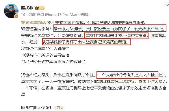 蓝占非一语成谶,国内直播的时候开玩笑说自己可能折在非洲,巧了,他在非洲旅游的时候还真就被绑了。 按照他的说法是老乡见老乡,背后捅一刀,而他的遭遇也是一场精心策划的劫持,早在他登上飞机的时候,机场人员就被收买,然后他到了下榻的酒店,酒店人员又被收买。也就是说,他的一切行动都被掌握。 最可恶的就是这个酒店内部员工,不仅提供了他的房间号,还提供了房卡。 然后一个花了大价钱的五星级酒店就被人轻而易举的入室。然后就是他在微博中所说的那样,脖子上凉凉的,一睁眼就是一把刀子,对方喊价三百万,然后就是对他进行了各种的取证,包括剥光衣服拍裸照,签署各种欠款文件,还要举身份证,拿女性衣服出来让我不停的揉指纹,收集他的口水、毛发、精液。 绑匪明显是精密策划,早有准备,据说劫匪有二套方案,第一套,就是假装粉丝带入准备好滴出租车直接绑走,可惜蓝战非不怕花钱,用的是正规出租车,躲过了一劫,所以,他们执行了第二套方案,晚上行动。 目前来看,恐怕他付出的300万只是刚刚开始。后续他的生物特征还能做出很多很多的案件。 幸好他没有被唬住,及时的报了帽子叔叔。 人怕出名猪怕壮,希望大网红们小心再小心,毕竟国外不同于国内。