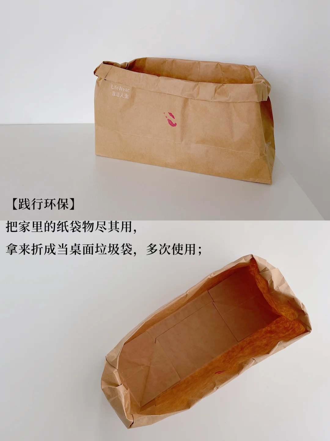 2、把家里的纸袋物尽其用,拿来折成当桌面垃圾袋,多次使用;