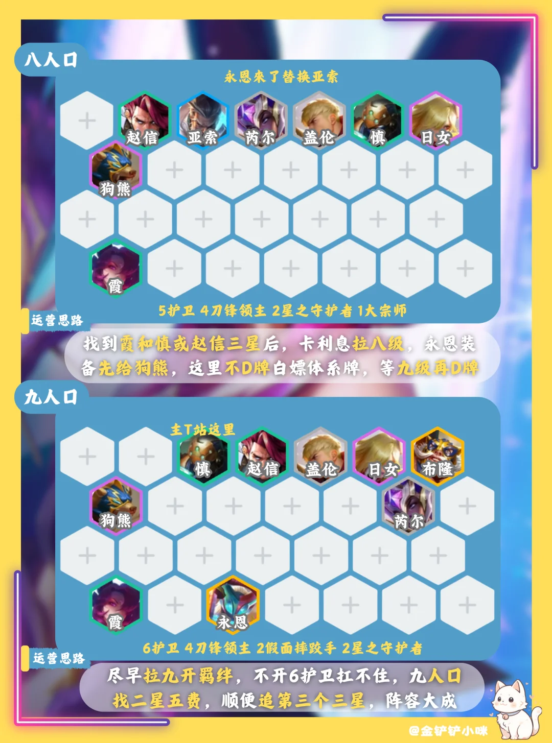 4️⃣阶段霞和任意前排三星后卡利息拉等级,八级永恩先来替换亚索,这里不D牌白嫖体系牌