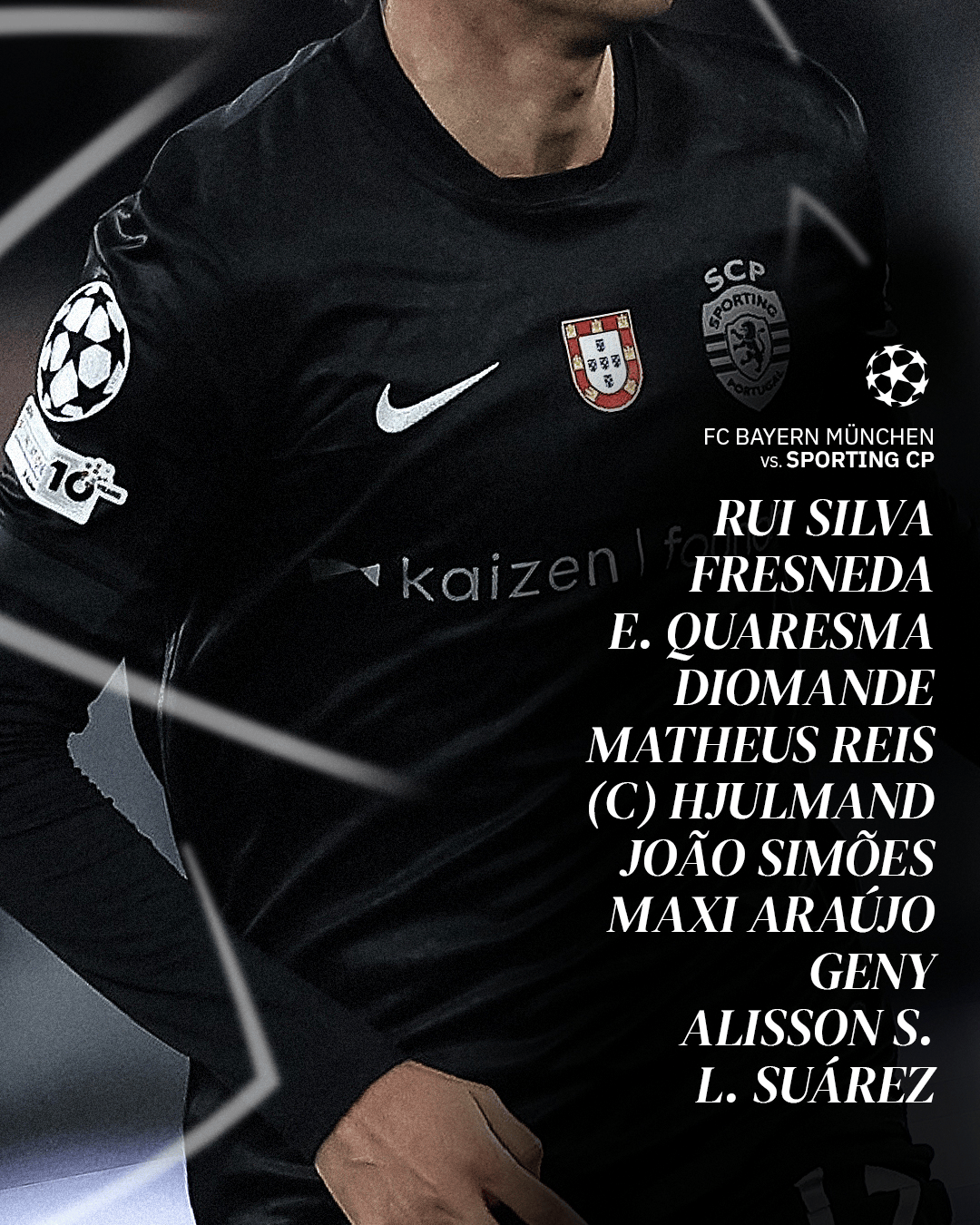 葡萄牙体育首发:1-鲁伊-席尔瓦、2-雷斯、72-夸雷斯马、26-迪奥曼德、22-弗雷斯内达、52-若昂-西蒙斯、42-尤尔曼、20-阿劳霍、27-阿利森-桑托斯、10-卡塔莫、97-苏亚雷斯