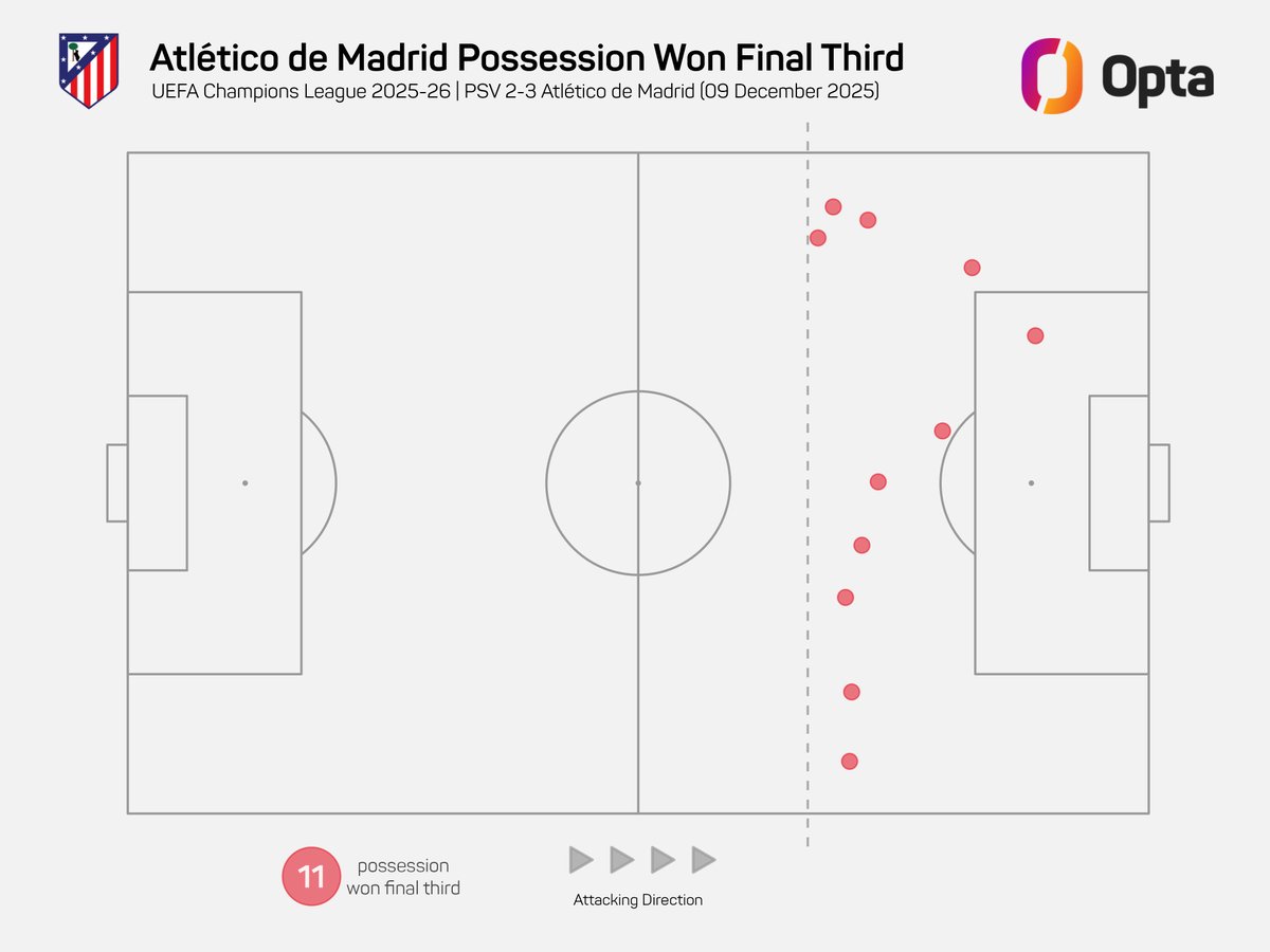虎扑12月10日讯在今晨结束的欧冠联赛中,埃因霍温主场2-3不敌马德里竞技。据OPTA报道,埃因霍温在本场欧冠比赛中被对手马德里竞技在进攻三区夺回球权11次。